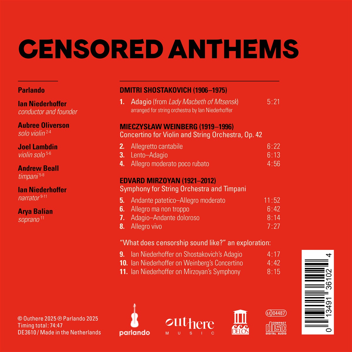 Der junge Dirigent, Musical America New Artist und BBC Rising Star Ian Niederhoffer erkundet zusammen mit seinem Orchester Parlando, wie die Musik als Mittel des kulturellen Widerstands angesichts einer Zensur wirkte. Der Fokus seines Albums liegt auf Komponisten, die zur Zeit der Sowjetunion mit Restriktion zu kämpfen hatten und enthält als erstes Schostakowitschs Adagio aus Lady Macbeth von Mzensk, ein Werk, das nach Stalins Missbilligung zensiert wurde. Es folgen das Concertino für Violine und Streichorchester von Mieczysław Weinberg, einem Komponisten, dessen Karriere durch die Verfolgung während Stalins antikosmopolitischer Kampagne geprägt wurde, und Edvard Mirzoyans Sinfonie für Streichorchester und Pauken, die ein eindrucksvolles Zeugnis für das Überleben der armenischen Kultur trotz der sowjetischen Russifizierung darstellt. Das Motto des Orchesters Parlando, „jedes Konzert erzählt eine Geschichte“, wird auf diesem Album wörtlich genommen und mit drei Tracks ergänzt. Ian Niederhoffer geht (auf englisch) in drei kurzen Erkärungen auf jedes Stück ein und erklärt anhand von muskalischen Elementen, wie die Zensur in die Kompositionen eingriff.