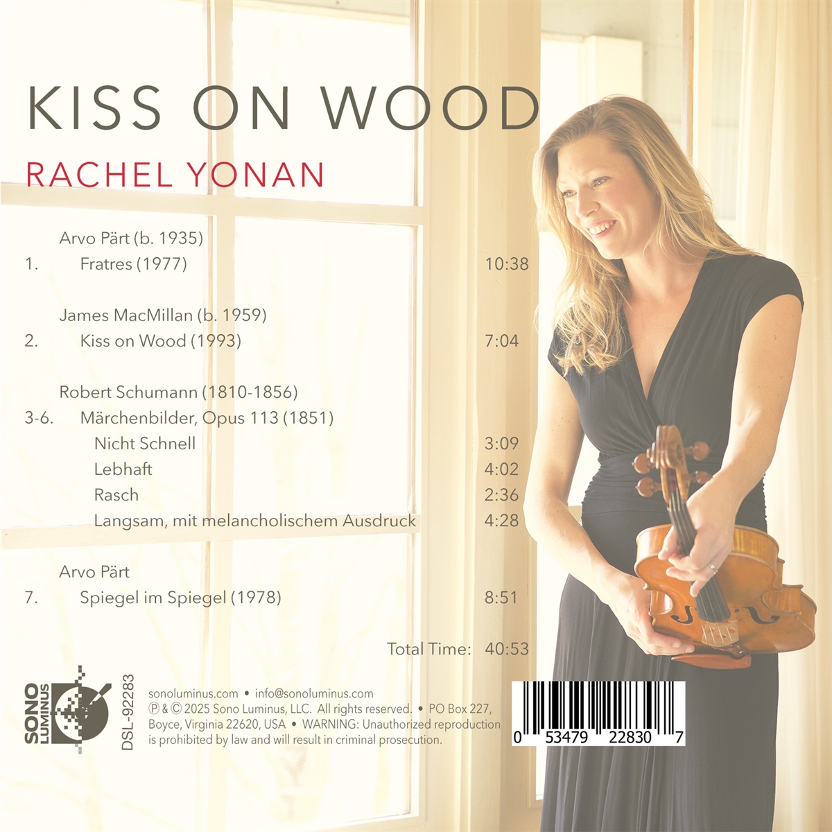 Im Mittelpunkt dieses Albums steht die Ersteinspielung von Sir James MacMillans „Kiss on Wood“ für Bratsche und Klavier, arrangiert und gespielt von Rachel Yonan und Kwan Yi, die sich mit der Polarität von Licht und Dunkelheit auseinandersetzen. Die beliebten Stücke „Fratres“ und „Spiegel im Spiegel“ des Minimalisten Arvo Pärt bilden den Abschluss des Programms. Das Konzept des Lichts durchdringt diese Stücke mit ihrer intensiven Klarheit und ihrer Suche nach transzendenter Bedeutung. Fratres (Bruderschaft) beschwört mit seinen kontrastierenden Stimmen den Kampf zwischen Gut und Böse. Spiegel im Spiegel (Mirror in Mirror) ist rein und stabil, da es die unendliche Reflexion zwischen zwei Spiegeln klanglich imaginiert. MacMillan lotet die Dunkelheit des Verlustes aus und findet doch zarte Strahlen der Hoffnung, die die langen Räume füllen. Diese intensiven und doch statischen Werke des einundzwanzigsten Jahrhunderts sind gepaart mit Schumanns Miniaturcharakterstücken „Märchenbilder“, die eine emotionale Palette von heiter und verspielt bis hin zu tief melancholisch verwenden. Der programmatische Titel jedes Werks Fratres, Kiss on Wood, Märchenbilder, Spiegel im Spiegel deutet auf eine Bedeutung hin, die nicht allein mit Worten ausgedrückt werden kann, sondern von der Musik erhellt werden muss.