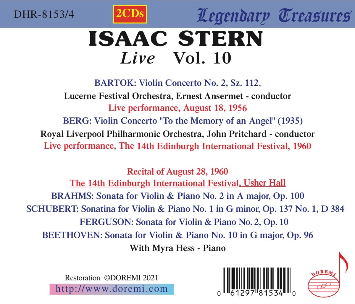 Der US-amerikanische Violinist Isaac Stern war einer der bedeutendsten und erfolgreichsten Violinisten des 20. Jahrhunderts. Die Isaac-Stern-Reihe beim Spezial-Label für historische Aufnahmen Doremi fasst herausragende Konzertmitschnitte zusammen. Auf Volume 10 sind Béla Bartóks Violinkonzert Nr. 2 (Live beim Lucerne Festival, 1956), Alban Bergs Violinkonzert „Dem Andenken eines Engels“ (Live beim Edinburgh Festival, 1960) und ein Recital mit Kammermusik von Brahms, Schubert, Ferguson und Beethoven (ebenfalls live beim Edinburgh Festival, 1960) zu hören.