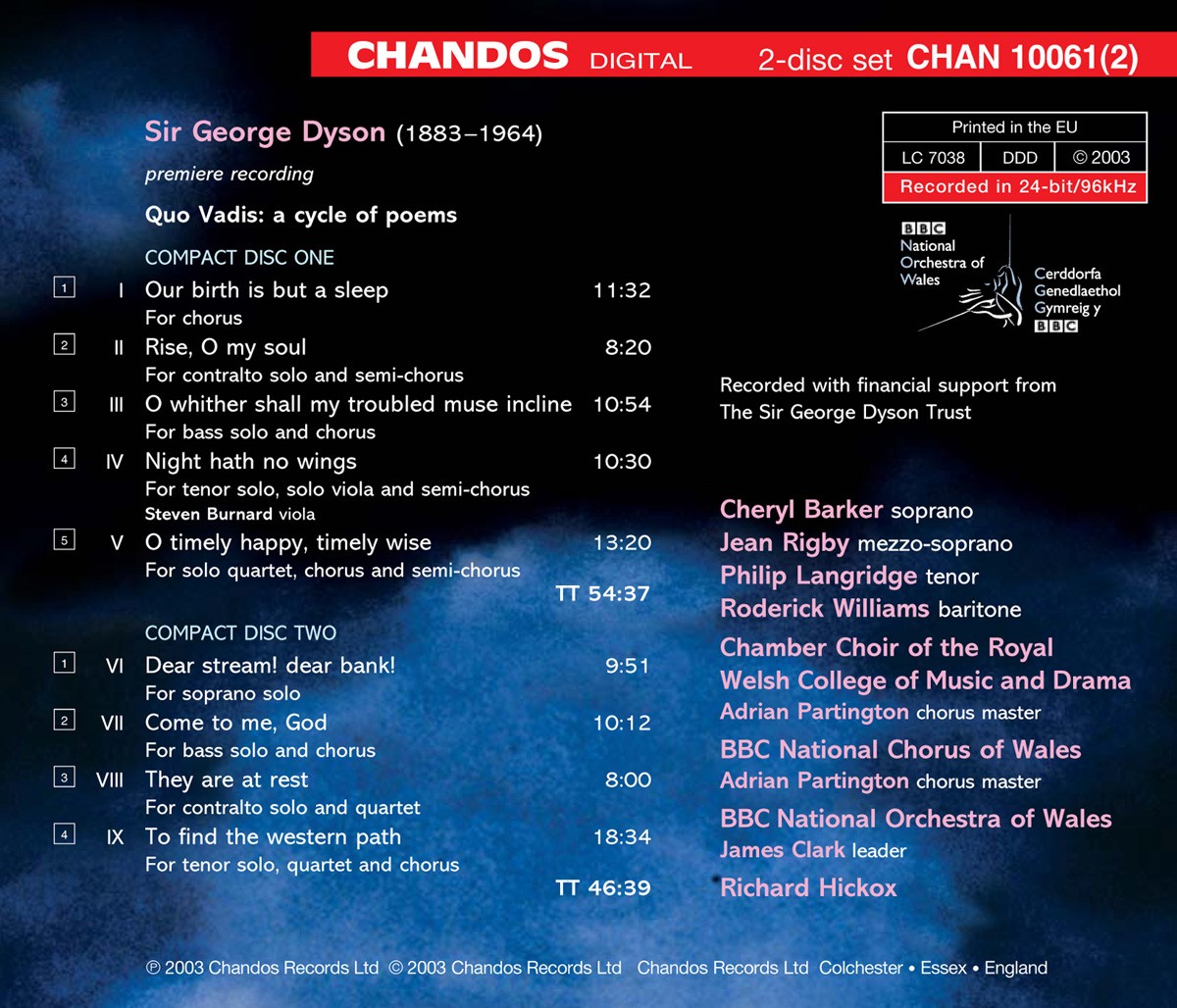 Barker, Cheryl / BBC National Chorus of Wales / BBC National Orchestra of Wales / Burnard, Steven / Hickox, Richard / Langridge, Philip / Rigby, Jean / Royal Welsh College Chamber Choir of Music and Drama / Williams, Roderick