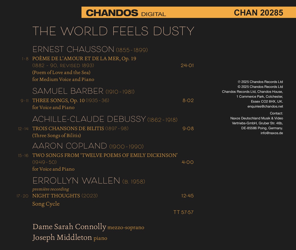 Dame Sarah Connolly und Joseph Middleton präsentieren ein reichhaltiges Programm mit Kunstliedern verschiedener Komponisten. Der Liederabend beginnt mit Ernest Chaussons „Poème de l’amour et de la mer“, dessen Komposition fast ein Jahrzehnt in Anspruch nahm und den Einfluss Richard Wagners auf den jüngeren Komponisten deutlich macht. Samuel Barbers „Three Songs“, komponiert 1935 während einer Studienreise nach Rom, vertont Gedichte von James Joyce und schildert drei Liebesbeziehungen. Claude Debussys „Trois Chansons de Bilitis“ vertont die erotischen Gedichte von Pierre Louÿs, die um die Jahrhundertwende in Paris Furore machten. Aaron Copland vollendete seine „Twelve Poems“ von Emily Dickinson 1950, erklärte jedoch, dass sie nicht als Zyklus, sondern als zwölf Einzelwerke zu betrachten seien. Connolly nimmt hier „I’ve heard an organ talk sometimes“ und „The world feels dusty“ auf, wobei letzteres dem Album seinen Titel gibt. Das Programm endet mit der Erstaufnahme von Errollyn Wallens „Night Thoughts“: einem Zyklus von vier Liedern, der von Leeds Lieder in Auftrag gegeben und von Sarah Connolly und Joseph Middleton, den Widmungsträgern des Zyklus, uraufgeführt wurde. Der Zyklus, der zwei ihrer eigenen Gedichte neben einem Gedicht von Emily Dickinson und Zeilen aus Shakespeares „Macbeth“ stellt, wurde von Howard Hodgkins Gemälde „Night Thoughts“ inspiriert.