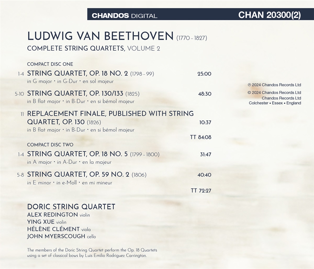 Für diese zweite Folge von Ludwig van Beethovens Streichquartetten hat das Doric String Quartet ein Quartett aus der mittleren, ein Quartett aus der späten und zwei Quartette aus der frühen Schaffensphase zu einem Programm zusammengestellt, das sowohl für sich allein steht als auch Teil des gesamten Zyklus ist. Die Musiker beginnen mit einer lebhaften Darbietung von op. 18 Nr. 2 und spielen anschließend das Quartett op. 130, in dem sie als Finale die „Große Fuge“ op. 133 aufführen, wie Beethoven sie lange in Betracht gezogen hatte. Sie haben das alternative Finale angefügt, das erstmals mit op. 130 veröffentlicht wurde, sodass der Zuhörer zwischen beiden Versionen wählen kann. Auf op. 18 Nr. 5 in A-Dur folgt dann op. 59 Nr. 2 in e-Moll. Op. 18, Beethovens erste Quartettsammlung, zeigt oft Einflüsse aus den Quartetten von Haydn und Mozart, wenn auch stark gefiltert durch Beethovens ursprüngliche künstlerische Sensibilität. Die zweite Gruppe, die drei „Rasumowski-Quartette“, op. 59, wurde in einer goldenen Phase des kreativen Lebens des Komponisten geschrieben (neben der Vierten Symphonie, dem Violinkonzert und Fidelio) und zeigt sowohl eine Weiterentwicklung gegenüber der früheren Gruppe als auch eine kraftvolle Eigenständigkeit. Obwohl sie von ihrem ersten Publikum missverstanden (oder als unverständlich empfunden) wurden, werden Beethovens späte Quartette heute allgemein als einer der Höhepunkte der westlichen Kunstmusik bewundert. Strawinski betrachtete die „Große Fuge“ als ein ‚absolut zeitgenössisches Musikstück, das für immer zeitgenössisch sein wird‘.