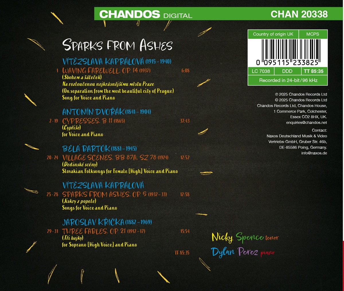 Nicky Spence verfügt über einzigartige Fähigkeiten als Gesangsdarsteller und eine seltene musikalische Ehrlichkeit, die ihm einen Platz an der Spitze der klassischen Musikwelt eingebracht haben. Besonders bewundert wird er für seine Interpretation der Musik von Leoš Janáček, dessen Opern er weltweit aufgeführt hat. Zusammen mit dem herausragenden Pianisten Dylan Perez präsentiert er ein abwechslungsreiches Programm mit tschechischen und slowakischen Kunstliedern. Béla Bartók entdeckte seine lebenslange Begeisterung für Volksmusik 1904 während eines Urlaubs in der Slowakei, als er ein Kindermädchen singen hörte. „Dorfszenen“ ist eine Vertonung von fünf Volksliedern aus einer großen slowakischen Sammlung, die 1915 veröffentlicht wurde und verschiedene Aspekte einer ländlichen Hochzeit schildert. Jaroslav Křička wurde zu einer zentralen Figur des tschechischen Musiklebens und bekleidete unter anderem die Ämter des Chorleiters der Tschechischen Philharmonie und des Professors für Komposition am Prager Konservatorium. Seine „Drei Fabeln für Sopran und Klavier“ sind Vertonungen traditioneller Märchen. Vítězslava Kaprálová war eine vielversprechende Komponistin, die 1940 im Alter von nur 25 Jahren an Tuberkulose starb. Sie studierte Dirigat bei Václav Talich und Komposition bei Vítězslav Novák, bevor sie nach Paris zog, wo sie bei Bohuslav Martinů Unterricht nahm. Ihr Liederzyklus „Glühende Asche“ behandelt Themen rund um die Liebe – gefunden, erblüht und verloren –, ebenso wie die achtzehn Lieder von Antonín Dvořáks Liederzyklus „Zypressen“. Das vier Jahre später von Kaprálová komponierte, eindringliche „Winkend Abschied nehmen“ wurde durch ihren Abschied von Prag und ihren Umzug nach Paris inspiriert.