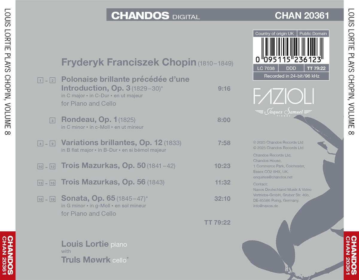 Louis Lorties Programm für diesen achten und letzten Teil von Frédéric Chopin umfasst die gesamte Karriere des Komponisten, vom Rondo, op. 1 aus seiner Jugend bis zu seinem letzten veröffentlichten Werk, der Cellosonate, op. 65. Inspiriert durch einen Besuch auf dem Anwesen von Prinz Antoni Radziwiłł im Jahr 1829, wurde die „Introduction et Polonaise brillante“, op. 3 für den Prinzen (ein begeisterter Cellist) und seine Tochter Wanda, eine Pianistin, geschrieben und 1831 in Wien veröffentlicht, kurz bevor Chopin nach Paris zog. Die „Variations brillantes“, op. 12 basieren auf dem Thema „Je vends des Scapulaires“ aus der (heute längst vergessenen) Oper „Ludovic“. Chopin, der allein für die Popularität der Mazurka verantwortlich war, schrieb in seinem Leben fast sechzig dieser Werke. Die beiden hier vorgestellten Zyklen stammen aus den Jahren 1842 (op. 50) und 1844 (op. 56), als der Komponist auf dem Höhepunkt seines Schaffens stand – und in den Salons von Paris äußerst beliebt war. Die Komposition der Cellosonate fiel Chopin nicht leicht und brauchte zwei Jahre, von 1845 bis 1847, bevor er sie schließlich bei seinem letzten öffentlichen Konzert in Paris am 16. Februar 1848 uraufführte. Er war bestrebt, einen „neuen Stil” in seiner Komposition zu finden, während er gleichzeitig mit seiner schlechten Gesundheit und dem Zusammenbruch seiner langjährigen Beziehung zur Schriftstellerin George Sand zu kämpfen hatte. Seine Beharrlichkeit zahlte sich aus, und die Sonate ist bis heute ein Meilenstein des Repertoires.