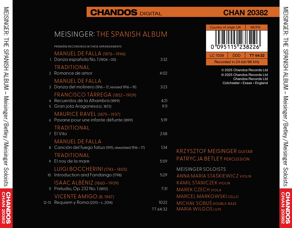Krzysztof Meisinger, geboren 1984, ist einer der faszinierendsten und charismatischsten klassischen Gitarristen unserer Zeit. Seine künstlerische Entwicklung wurde durch den tiefgreifenden Einfluss von Lehrern und Musikgrößen wie Aniello Desiderio (Italien) und Christopher Parkening (USA) geprägt. Sein Talent, das mit dem des Pianisten Piotr Anderszewski und des Gitarristen Pepe Romero verglichen wird, hat ihn auf der ganzen Welt auftreten lassen. Der Musikwissenschaftler Nigel Simeone merkt an: ‚Von traditionellen Liedern bis hin zu einem der führenden Flamenco-Komponisten der Gegenwart, über Musik, die von den Eindrücken und Klängen Spaniens vom 18. bis zum frühen 20. Jahrhundert inspiriert ist, präsentiert Meisingers „The Spanish Album“ die Gitarre als Hauptdarsteller in einem Programm von Arrangements, die von Streichern und Schlagzeug begleitet werden. Dazu kommen Neubearbeitungen, die vielleicht nicht überraschender sind als die Musik selbst, die größtenteils durch die kreative Vorstellungskraft von Komponisten von Boccherini bis Falla gefiltert wurde. Die Streicherbegleitung auf dieser Aufnahme verleiht der Gitarre Wärme, Farbe und tragende Harmonien und wird durch improvisierte Schlagzeugparts ergänzt – von temperamentvollen Kastagnetten bis hin zu den zarten, atmosphärischen Klängen von Stabglocken.‘