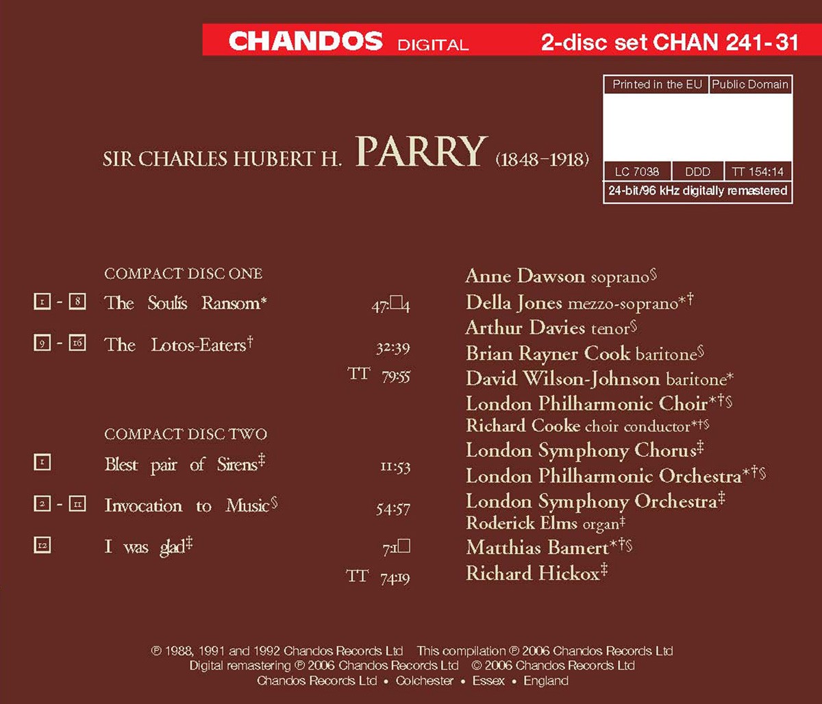 Bamert, Matthias / Davies, Arthur / Dawson, Anne / Elms, Roderick / Hickox, Richard / Jones, Della / London Philharmonic Choir / London Philharmonic Orchestra / London Symphony Chorus / London Symphony Orchestra / Rayner Cook, Brian / Wilson-Johnson, David