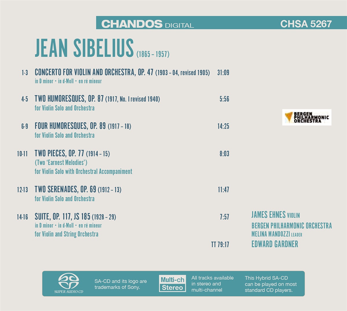 Jean Sibelius (geb. als Johan Julius Christian Sibelius) studierte in seiner Jugend Geige und erwog während eines Großteils seines Studiums aktiv eine Karriere als professioneller Violinist. Nach seinem Abschluss am Konservatorium in Helsinki im Jahr 1890 ging er nach Wien, um dort sein Studium fortzusetzen, und bewarb sich dort sogar (erfolglos) um einen Platz bei den Wiener Philharmonikern. Es ist also nicht überraschend, dass das Instrument eine wichtige Rolle in seinem kompositorischen Schaffen spielte. Überraschend ist vielleicht, dass er nur ein einziges Violinkonzert komponierte, was möglicherweise auf die schwierige Konzeption des Werks zurückzuführen ist. Die Uraufführung erhielt gemischte Kritiken und führte zu einer umfassenden Überarbeitung der Partitur. Erst als Jascha Heifetz in den 1930er Jahren begann, das Konzert regelmäßig aufzuführen, erlangte es seinen Platz im Standardrepertoire. Obwohl es kein zweites Konzert gab, sind Sibelius' zahlreiche andere Werke für Violine und Orchester keine bloßen Miniaturen, wie die Aufnahmen auf diesem Album eindrucksvoll beweisen. Der international gefeierte Virtuose James Ehnes wird hier vom Bergen Philharmonic Orchestra unter der Leitung von Edward Gardner begleitet.
