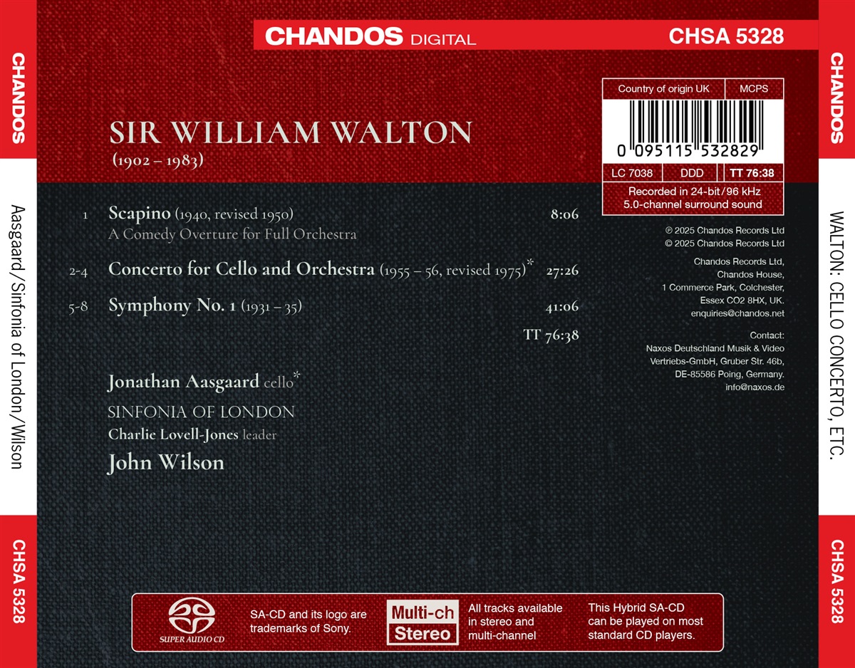 Die Erste Sinfonie wurde weitgehend von William Waltons stürmischer Liebesbeziehung mit der verwitweten Baronin Imma von Doernberg inspiriert, die der Komponist 1929 kennenlernte und mit der er Anfang der 1930er Jahre zusammenlebte. Obwohl die Entstehung des Werks lange dauerte und sich insbesondere die Komposition des Finales verzögerte, wurde das Ergebnis allgemein als herausragender Erfolg gefeiert. John Ireland kommentierte: ‚Im Gegensatz zu anderen englischen Sinfonien steht dieses Werk in der echten Tradition der Sinfonik. Es ist einfach kolossal, grandios, originell und bewegt die Emotionen auf das Äußerste…‘. Waltons Stern war in den 1950er Jahren im Sinken begriffen, da seine Oper „Troilus & Cressida“ nicht gut ankam und sein „Cellokonzert“ ebenso negative Kritiken erhielt, denn es wurde aufgrund seines im Wesentlichen neoromantischen Stils weithin als peinlich altmodisch angesehen. Das von Gregor Piatigorsky (auf Anregung von Jascha Heifetz) in Auftrag gegebene Werk wurde im Januar 1957 unter Charles Munch in Boston uraufgeführt, die britische Premiere folgte einen Monat später unter Sir Malcolm Sargent. Walton konnte diesem Konzert nicht beiwohnen, da er nach einem Autounfall auf der Fahrt von seinem Wohnort in Italien nach London ins Krankenhaus eingeliefert worden war. Das Werk, das heute weithin als eine der wichtigsten späten Kompositionen Waltons gilt, wird hier vom Solocellisten der Sinfonia of London, Jonathan Aasgaard, gespielt. Es wurde in Surround Sound aufgenommen und ist als Hybrid-SACD und in Dolby Atmos Spatial Audio erhältlich.