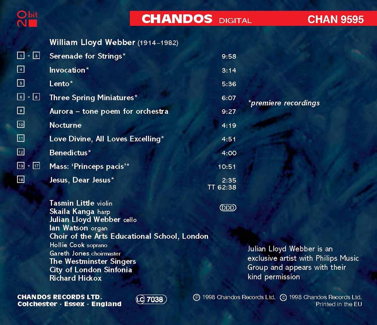 Antrobus, John / City of London Sinfonia / Cook, Hollie / Hickox, Richard / Kanga, Skaila / Little, Tasmin / Lloyd Webber, Julian / London Arts Educational School Choir / Watson, Ian / Westminster Singers