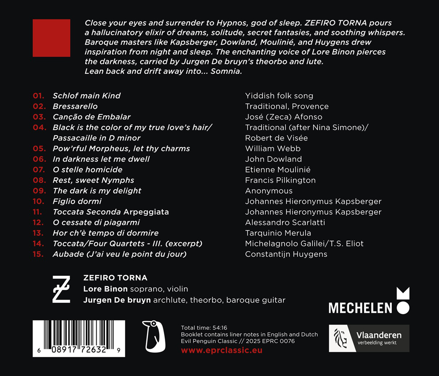 Im Laufe der Jahrhunderte haben sich Schriftsteller, Maler und Komponisten vom Phänomen des Schlafes inspirieren lassen – diesem geheimnisvollen Reich der Dämmerung, in das die Sterblichen nachts verschwinden, um bei Tagesanbruch wieder zu erwachen. Im Programm „Somnia“ wagt sich das Ensemble Zefiro Torna mit exquisiten Kompositionen aus der Spätrenaissance und dem Barock sowie zeitloser Volksmusik aus verschiedenen Teilen der Welt in die musikalische Dämmerung vor. Unter der Führung von Hypnos und seinen Verwandten tauchen die Musiker in das Paralleluniversum des Schlafes ein, wo Zärtlichkeit und Grausamkeit herrschen, Träume frei fließen und nichts so ist, wie es scheint. Zefiro Torna unter der Leitung von Jurgen De Bruyn, der Archlute, Theorbe und Barockgitarre spielt, hat ein faszinierendes Programm zusammengestellt, darunter Kompositionen von John Dowland, Alessandro Scarlatti und Tarquinio Merula, um nur einige zu nennen. Zu ihnen gesellt sich die Sopranistin und Geigerin Lore Binon, die in der Oper, dem sinfonischen Repertoire und der Alten Musik daheim ist und die Mitbegründerin des Ensemble Revue Blanche ist.
