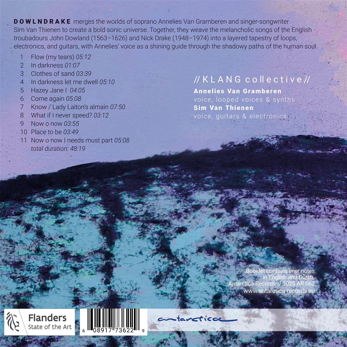 In „DowlandDrake“ vereinen die Sopranistin Annelies Van Gramberen und der Singer-Songwriter Sim Van Thienen ihre Welten zu einem neuen Klanguniversum. Gemeinsam nehmen sie den Zuhörer mit auf eine abenteuerliche Reise durch schattige Pfade und in die verborgenen Tiefen der menschlichen Seele. Die Lieder der Troubadoure und „Ritter der Melancholie“ John Dowland und Nick Drake bilden den Ausgangspunkt für diese intensive musikalische Reise. In den zarten und oft tief melancholischen Lautenliedern von John Dowland (1563–1626) schwingen Sehnsucht und Verlust in jeder Note mit. Sie verschafften ihm einen Platz unter den berühmtesten Komponisten und Lautenspielern der englischen Renaissance. Seine Lieder wurden in mehreren „Bookes of Songes“ or „Ayres“ gesammelt, die sich großer Beliebtheit erfreuten und mehrfach nachgedruckt wurden. Vier Jahrhunderte später brachte der Singer-Songwriter Nick Drake (1948–1974) dieselbe emotionale Intensität in seine eigenen Kämpfe und existenziellen Fragen ein. Mit spärlichen, zarten Gitarrenakkorden und einer zerbrechlichen Stimme schuf er in seinen zeitlosen Liedern eine verträumte, intime Klangwelt. Im Gegensatz zu Dowland erlangte Drake erst nach seinem Tod die Anerkennung, die er verdiente. Annelies Van Gramberen und Sim Van Thienen spielen die Lieder nicht einfach nur, sondern zerlegen sie und formen sie zu neuen, originellen Kreationen um. Vor dem Hintergrund einer reichhaltigen Klanglandschaft aus Gesangs- und Instrumentalloops, Elektronik und einem Arsenal an Gitarren haucht Annelies' Stimme der Musik neues Leben ein. Die Spannung zwischen den bearbeiteten, manchmal künstlichen Texturen der Elektronik und der natürlichen, organischen Wärme der klassischen Stimme und der Akustikgitarre führt zu einer frischen und überraschend nahtlosen Interpretation dieses Repertoires.