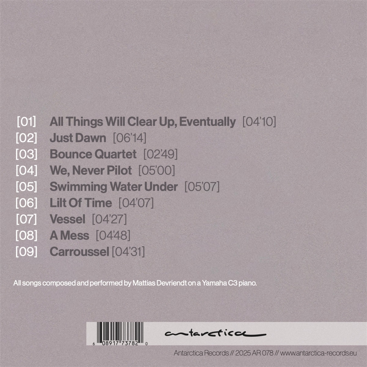 Mit seinem zweiten Album “All Things Will Clear Up, Eventually” möchte der belgische Komponist und Pianist Mattias Devriendt die Zuhörenden ermutigen, in sich selbst hineinzuhören. So wie ein Mensch auf dem Rücken liegt und den Wolken nachschaut und sich dabei selbst vergisst, völlig neue Formen und Farben wahrnimmt und so seine geistige Gesundheit bewahrt, soll auch die Musik dazu einladen, innezuhalten und hoffentlich, mitten in schwierigen Zeiten, Lichtblicke zu entdecken – kindlich Bilder inmitten der Düsternis. Mattias Devriendts Musik ist an vielen Orten zu Hause: Festival-Bühnen, intime Dachböden, Konzerte in Kirchen oder Auftritte am Strand. Er sieht sich in der Tradition von Keith Jarrett, Jóhann Jóhannsson, Philip Glass, Ryuichi Sakamoto oder Nils Frahm.