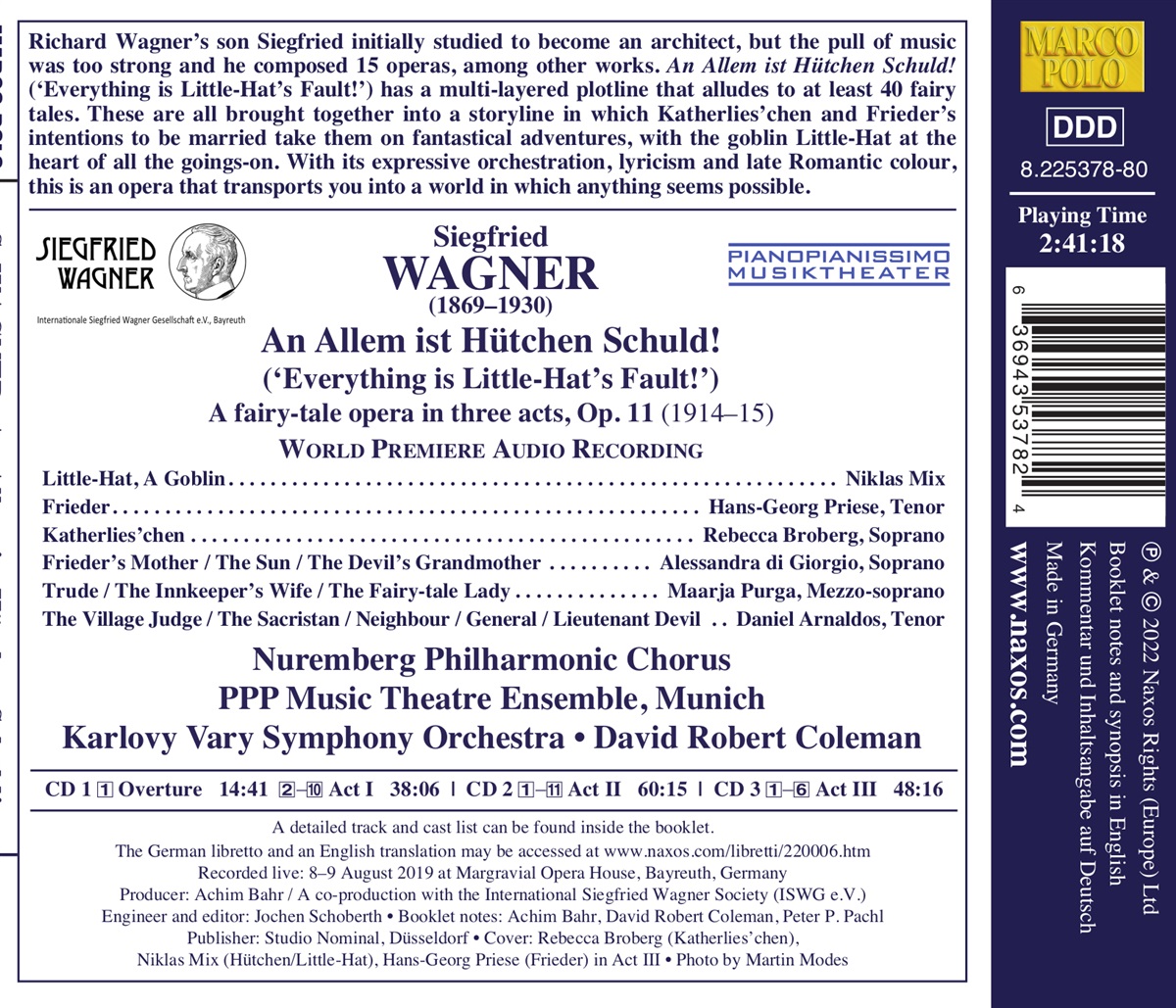 Eigentlich wollte Siegfried Wagner Architekt werden, doch der Name Wagner war wohl zu sehr eine Verpflichtung für ihn, sodass er sich der Musik zuwandte, sowohl als Komponist (und Schüler Humperdincks) als auch als Dirigent. Seine Oper „An Allem ist Hütchen Schuld!" hat eine vielschichtige Handlung die auf fast 40 Märchen anspielt. Sie alle werden zu einer Geschichte zusammengefügt, in der Katherlies‘chen und Frieder mit ihren Heiratsabsichten fantastische Abenteuer erleben, in deren Mittelpunkt der Kobold Hütchen steht. Mit seiner ausdrucksstarken Orchestrierung, Lyrik und spätromantischem Kolorit ist diese Oper ein Paradebeispiel für Siegfried Wagners Ästhetik.