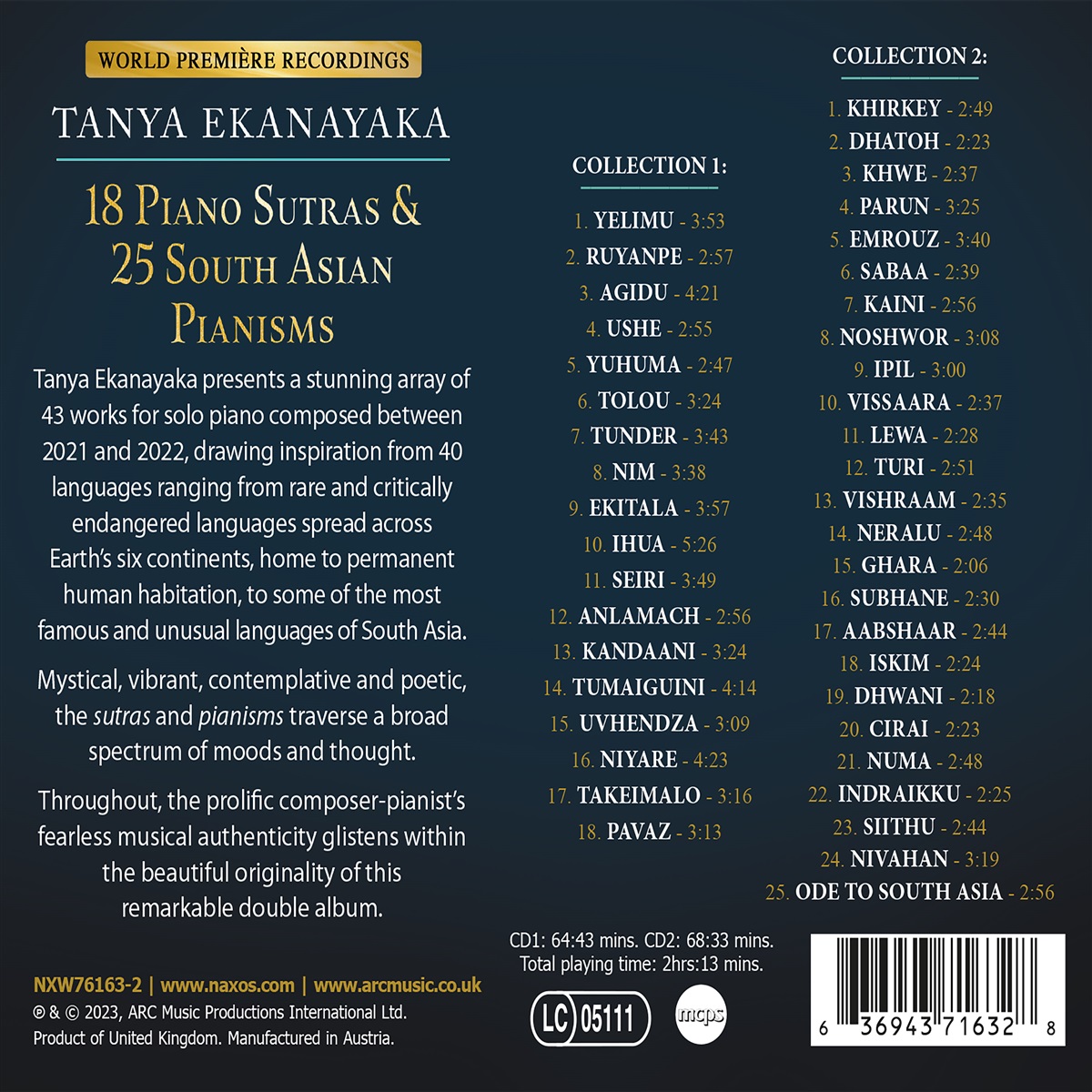 Tanya Ekanayaka präsentiert eine atemberaubende Auswahl von 43 Werken für Soloklavier, die zwischen 2021 und 2022 komponiert wurden. Die Inspiration erhielt Ekanayaka von 40 Sprachen - von seltenen und bedrohten Sprachen, die über die sechs Kontinente der Erde verteilt sind, bis hin zu einigen der berühmtesten und ungewöhnlichsten Sprachen Südasiens. Mystisch, lebendig, kontemplativ und poetisch, durchqueren die Sutras und Pianismen ein breites Spektrum an Stimmungen und Gedanken. Tanyas musikalische Authentizität glänzt in der wunderschönen Originalität dieses bemerkenswerten Doppelalbums.