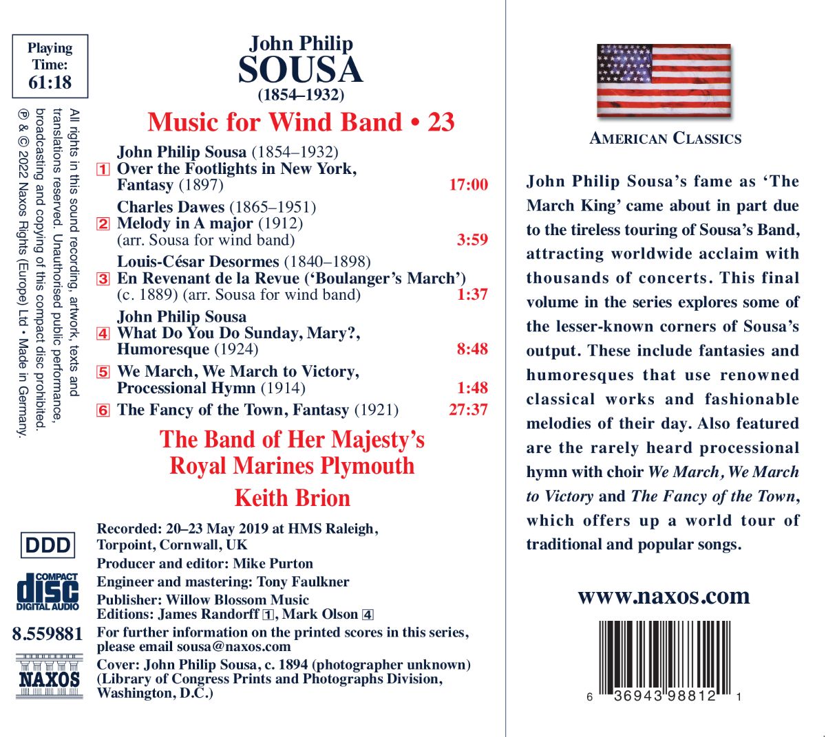 John Philip Sousas Ruhm als „König der Marschmusik“ entstand vor allem durch seine unermüdlichen Tourneen seiner Sousa Band, die mit Tausenden von Konzerten weltweite Anerkennung erhielt. Dieses letzte Album der Gesamteinspielung seiner Musik für Blasinstrumente erforscht einige der weniger bekannten Winkel in Sousas Schaffen. Dazu gehören Fantasien und Humoresken, die bekannte klassische Werke und Melodien ihrer Zeit verwenden. Ebenfalls enthalten sind die selten gespielte Prozessionshymne mit Chor „We March, We March to Victory“.