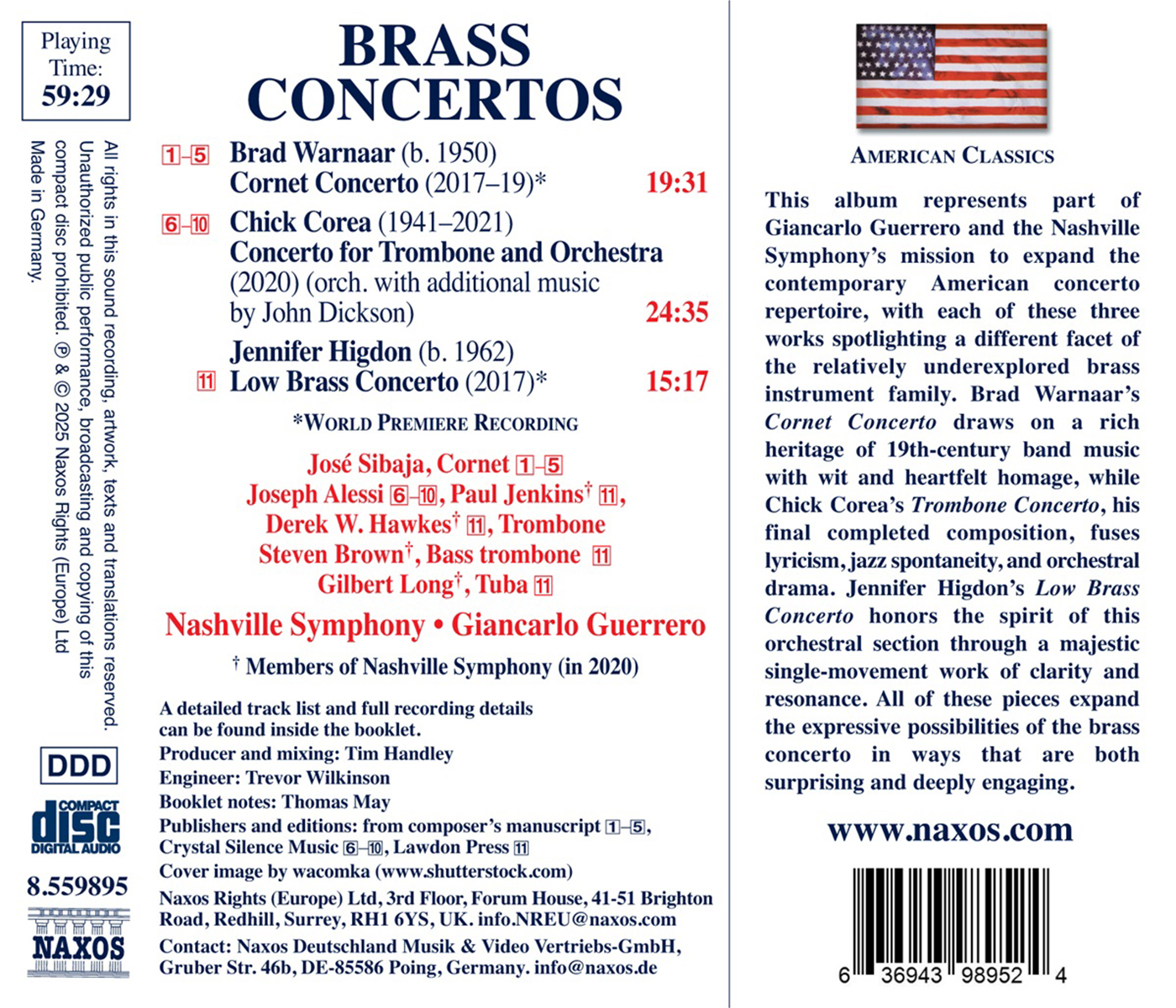 Dieses Album ist Teil der Mission von Giancarlo Guerrero und dem Nashville Symphony Orchestra, das zeitgenössische amerikanische Konzertrepertoire zu erweitern. Jedes dieser drei Werke beleuchtet eine andere Facette der relativ unbeachteten Familie der Blechblasinstrumente. Brad Warnaars Kornettkonzert greift mit Witz und herzlicher Hommage auf das reiche Erbe der Blasmusik des 19. Jahrhunderts zurück, während Chick Coreas Posaunenkonzert, seine letzte vollendete Komposition, Lyrik, Jazz-Spontaneität und orchestrale Dramatik miteinander verbindet. Jennifer Higdons „Low Brass Concerto“ oder Tiefblechkonzert würdigt den Geist dieser Orchestergruppe durch ein majestätisches einteiliges Werk von Klarheit und Resonanz. Alle diese Stücke erweitern die Ausdrucksmöglichkeiten des Blechbläserkonzerts auf überraschende und zugleich tief bewegende Weise. Die Solisten dieser Aufnahme gehören zur Spitzenklasse der Blechbläser. José Sibaja (Warnaar) ist einer der vielseitigsten und renommiertesten Trompeter seiner Generation mit weltweiten Konzerten und Rundfunkauftritten in den Musikgenres Klassik, Latin, Jazz und Pop. Joseph Alessi (Corea) ist Posaunist bei den New York Philharmonic und kann auf eine bemerkenswerte Solisten- und Aufnahmekarriere zurückblicken, darunter sein Album „Return to Sorrento“ und die Aufführung von Stephen Grycs Posaunenkonzert „Passagi“. Higdons „Low Brass Concerto“ wird von den Musikern der renommierten Blechbläsersektion des Nashville Symphony Orchestra meisterhaft gespielt. Ihre Aufnahme von Michael Daughertys „Metropolis Symphony“ wurde mit mehreren Grammy Awards ausgezeichnet. Giancarlo Guerrero ist ein sechsfacher Grammy-Gewinner, der für seine fantasievollen Programme bekannt ist. Als Musikdirektor der Nashville Symphony setzte er sich 16 Spielzeiten lang durch Auftragswerke, Aufnahmen und Aufführungen für zeitgenössische amerikanische Musik ein. Unter seiner Leitung brachte die Nashville Symphony 24 Werke von Komponisten wie Béla Fleck, Ben Folds, Jennifer Higdon, Hannibal Lokumbe, Terry Riley, Wayne Shorter und Victor Wooten zur Uraufführung.