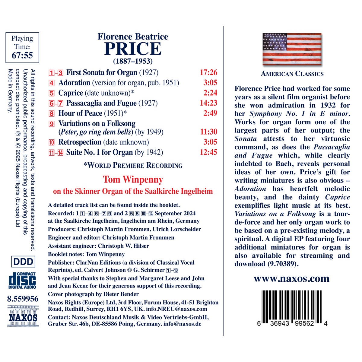 Florence Price arbeitete einige Jahre als Stummfilmorganistin, bevor sie 1932 mit ihrer „Sinfonie Nr. 1 in e-Moll“ Beachtung fand. Werke für Orgel bilden einen der größten Teile ihres Schaffens; die „Sonate“ zeugt ebenso wie die „Passacaglia und Fuge“, die zwar eindeutig Johann Sebastian Bach verpflichtet ist, aber auch ganz eigene Ideen der Komponistin erkennen lässt, von ihrer virtuosen Beherrschung des Instruments. Prices Begabung für das Schreiben von Miniaturen ist ebenfalls offensichtlich – „Adoration“ besticht durch ihre herzliche melodische Schönheit, und die zierliche „Caprice“ ist ein Paradebeispiel für leichte Musik vom Feinsten. „Variations on a Folksong“ ist eine Glanzleistung und ihr einziges Orgelwerk, das auf einer bereits existierenden Melodie, einem Spiritual, basiert. Eine digitale EP mit vier weiteren Miniaturen für Orgel ist ebenfalls zum Streamen und Herunterladen erhältlich. Der Organist Tom Winpenny ist regelmäßig im BBC-Radio zu hören und war in der Sendung „Pipedreams“ des amerikanischen öffentlich-rechtlichen Senders American Public Media zu Gast. Als Solist trat er international auf, zuletzt in Schweden, Deutschland, Italien und den USA.