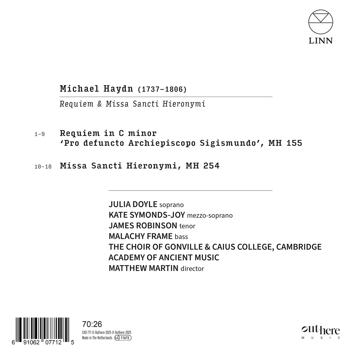 Unter der Leitung seines Dirigenten Matthew Martin führt der Chor des Gonville & Caius College Cambridge, gemeinsam mit der Academy of Ancient Music, selten gehörte Meisterwerke von Michael Haydn auf: das Requiem und die Missa Sancti Hieronymi. Die vier Solisten sind allesamt ehemalige Schlüler des Caius Choir, was die hervorragende musikalische Tradition dieser Studentengruppe unterstreicht. Der zu Unrecht wenig beachtete jüngere Bruder von Joseph Haydn war selbst ein begabter Komponist. Das tief emotionale Requiem, das er nach dem Tod seiner kleinen Tochter und seines Mäzens schrieb, ist ein Meisterwerk, das komplexe farbige Texturen und Formen mit fantasievoller Orchestrierung und Vokalmusik verbindet. Mozart war ein großer Bewunderer, und es wird vermutet, dass Haydns Requiem der Prototyp für Mozarts eigenes, bekannteres Meisterwerk war. Im Gegensatz dazu ist die spätere Missa Sancti Hieronymi heller und optimistischer. Ungewöhnlicherweise für Oboen, Fagotte, Posaunen und Continuo (ohne obere Streicher) komponiert, strahlt sie Transparenz und freudige Energie aus. Diese Einspielung trägt sicherlich dazu bei, dass diese vernachlässigten Werke wieder mehr Aufmerksamkeit im Repertoire finden.