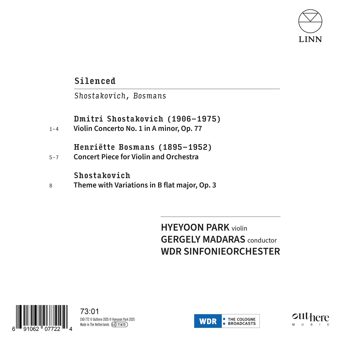 Die Geigerin Hyeyoon Park, Preisträgerin des Internationalen Musikwettbewerbs der ARD 2009, hat sich als Solistin und Kammermusikerin einen Namen gemacht und ist mit dem Symphonieorchester des Bayerischen Rundfunks, dem London Philharmonic Orchestra, dem NHK Symphony Orchestra, Kian Soltani, Timothy Ridout und Benjamin Grosvenor aufgetreten. „Silenced", ihr erstes Album bei Linn, das sie mit Gergely Madaras und dem WDR Sinfonieorchester aufgenommen hat und befasst sich den Werken zweier regimekritischer Komponisten. Schostakowitschs erstes Violinkonzert wurde wegen seiner „formalistischen Verzerrungen“ verboten und erst 1955, nach Stalins Tod, uraufgeführt. Das Konzertstück der niederländischen Komponistin Henriëtte Bosmans, die sich weigerte, der nationalsozialistischen Kultuurkamer beizutreten, ist introspektiv und bitter im Ton. Es entstand in einem Zustand der Trauer über das Verbot ihrer Musik. Schostakowitschs Variationen op. 3, eine jugendliche akademische Übung, beschließen das Album mit einem rauschenden Finale.