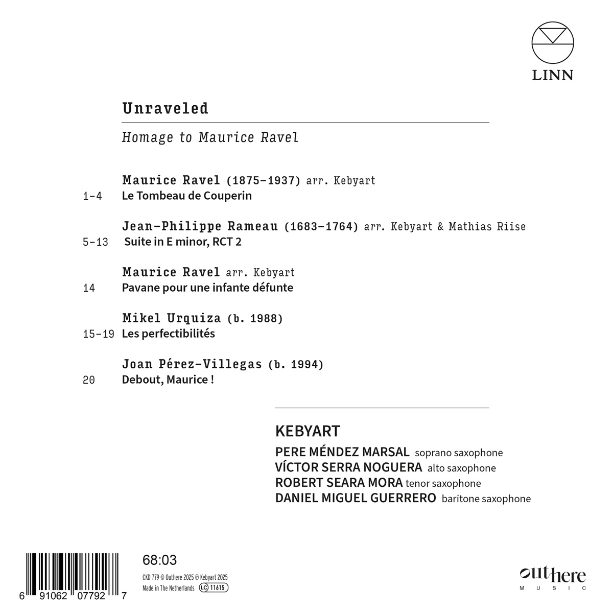 Anlässlich des 150. Geburtstags von Maurice Ravel im Jahr 2025 begibt sich das Ensemble Kebyart auf die Suche nach seinem einzigartigen kompositorischen Vermächtnis, auch wenn der Komponist nie für Saxophonquartett geschrieben hat. Das Album enthält Kebyarts Transkriptionen von Ravels „Le Tombeau de Couperin“ und „Pavane pour une infante défunte“ sowie Bearbeitungen französischer Barockwerke von Rameau, die sowohl Ravels Bewunderung für die Ornamentik als auch seinen Einfluss auf heutige Komponisten verdeutlichen. Neue Stücke von Mikel Urquiza und Joan Pérez-Villegas setzen sich mit Ravels musikalischer Philosophie auseinander, indem sie sich mit seiner radikalen Einfachheit, seinen subtilen rhythmischen Überlagerungen und seinen originellen Strukturen auseinandersetzen. Mit diesen Werken möchten die vier spanischen Musiker von Kebyart Ravels komplexen und doch eleganten Stil entschlüsseln und die Vergangenheit mit der Zukunft in einer musikalischen Entdeckungsreise verbinden.