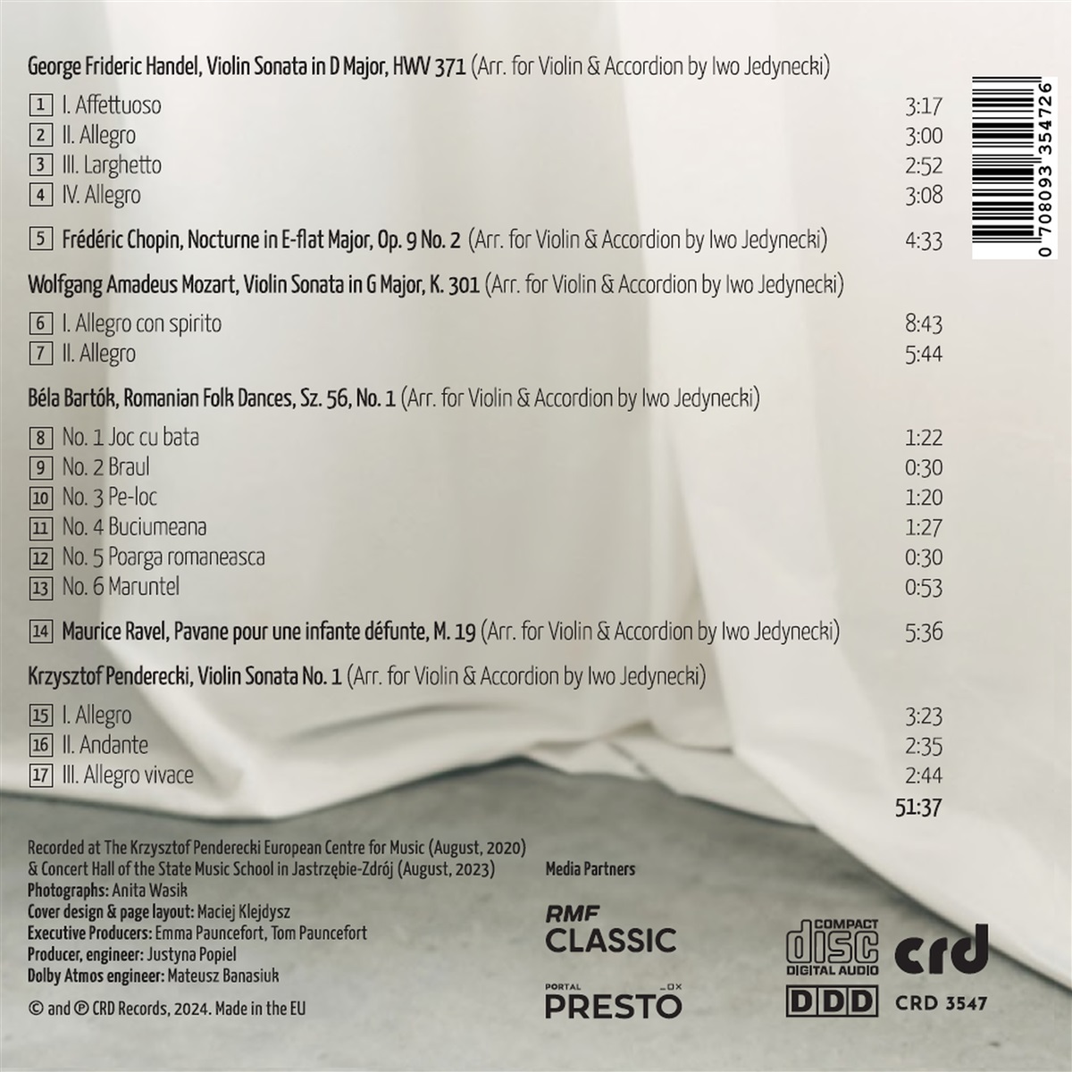 Die Violinistin Karolina Mikołajczyk und der Akkordeonist Iwo Jedynecki nehmen den Hörer mit auf eine Reise durch eine etwas andere Geschichte der Musik. 2013 kam das Duo zusammen, um Instrumente aus ganz unterschiedlichen Epochen zu kombinieren: die Geige, die seit Jahrhunderten in der klassischen Musik einen gigantischen Stellenwert einnimmt und das klassische Akkordeon, das fast ein Neuling zu nennen ist. Die Musiker haben alle Stücke selbst für ihre ungewöhnliche Besetzung arrangiert und zeigen Kompositionen von Georg Friedrich Händel, Frédéric Chopin, Wolfgang Amadeus Mozart, Béla Bartók, Maurice Ravel und Krzysztof Penderecki aus einer ganz anderen Perspektive.