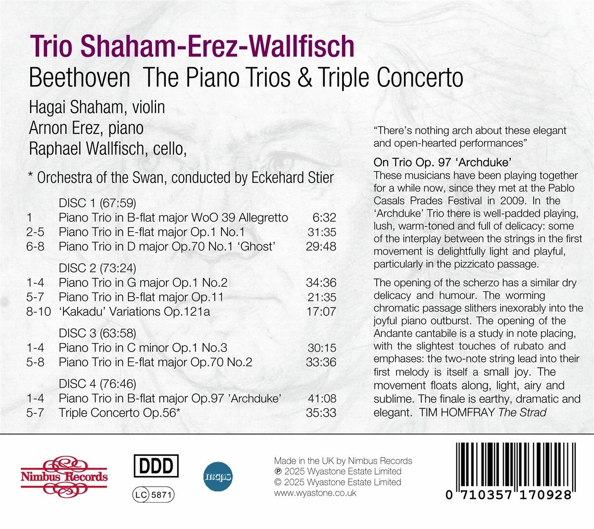 Obwohl Haydn und Mozart viel zur Entwicklung des Klaviertrios beitrugen, hauchte Beethoven dem Medium neues Leben und Dynamik ein, erweiterte seine Größe und seinen Umfang und bereicherte seine thematische und klangliche Substanz. Seine Trios bildeten einen Maßstab für die weitere Blüte des Genres im 19. Jahrhundert, wie die Werke von Franz Schubert, Felix Mendelssohn, Robert Schumann, Johannes Brahms und Antonín Dvořák zeigen. Das Trio Shaham Erez Wallfisch wurde 2009 gegründet und besteht aus drei der besten internationalen Instrumentalisten der Gegenwart. Als Hagai Shaham und Raphael Wallfisch beim Pablo Casals Prades Festival gemeinsam Kammermusik spielten, entwickelte sich eine unmittelbare musikalische Synergie. Arnon Erez schloss sich ihnen später im selben Jahr für Trio-Konzerte in Luzern und den Niederlanden an und das Trio Shaham Erez Wallfisch wurde gegründet.