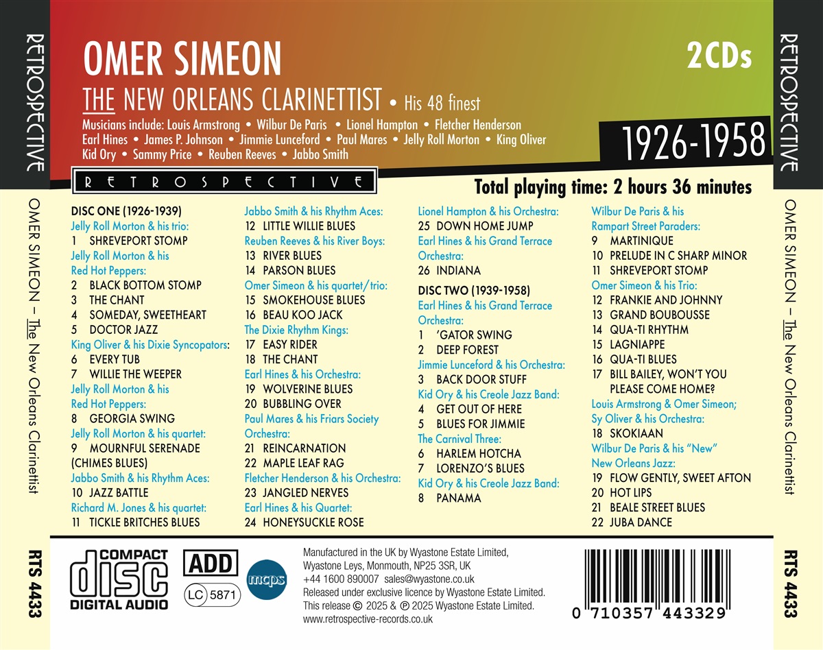 Omer Simeon (1902–1959) war der Inbegriff des New Orleans-Klarinettisten. Brian Rust beschrieb ihn so: „Sein brillantes, geschmackvolles und niemals exhibitionistisches Klarinettenspiel ist der Höhepunkt jeder Platte, auf der er zu hören ist.“ Die Richtigkeit dieses Urteils wird durch diese Retrospektive mit den 48 besten Aufnahmen eines vergleichsweise wenig bekannten Jazz-Giganten bestätigt. Sein Debüt in seiner 31 Jahre währenden Karriere als Musiker spielte eine entscheidende Rolle in den Jazz-Klassikern aller Zeiten von Jelly Roll Mortons Red Hot Peppers („Black Bottom Stomp“, „Doctor Jazz“). Er war Mortons Lieblingsklarinettist, spielte aber auch mit King Oliver („Every Tub“), Jabbo Smith („Jazz Battle“), Reuben Reeves („River Blues“), The Dixie River Kings („Easy Rider“) und Paul Mares („Reincarnation“). Nachdem er mit Earl Hines das Trio-Meisterwerk „Beau Koo Jack“ geschaffen hatte, verbrachte Simeon ein Jahrzehnt mit Hines’ Orchester und leistete wichtige Beiträge zu Stücken wie „Bubbling Over“ und „Honeysuckle Rose“. Außerdem spielte er mit den Big Bands von Fletcher Henderson, Lionel Hampton und Jimmie Lunceford. Es folgten Klassiker aus Kriegszeiten mit Kid Ory, darunter das ergreifende „Blues For Jimmie“, das nach dem Tod von Jimmie Noone entstand, sowie reizvolle Trio-Aufnahmen mit James P. Johnson („Harlem Hotcha“, „Lorenzo’s Blues“). Seine Karriere erlebte in den 50er Jahren mit Wilbur De Paris’ großartigem „New” New Orleans Jazz (7 großartige Titel, darunter das letzte Live-Stück „Juba Dance”) einen erneuten Schub. Aus dieser Zeit stammen auch sechs seltene Trio-Aufnahmen mit Simon Price und Zutty Singleton sowie das unwiderstehlich fröhliche „Skokiaan” mit Simeon am Sopransaxophon im Duett mit Louis Armstrong.