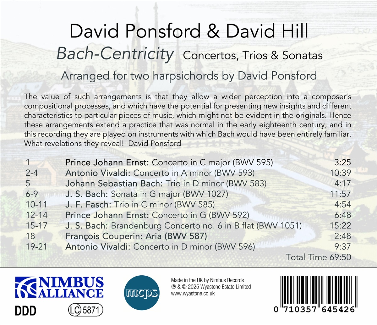 „The Two Davids“, wie David Ponsford und David Hill manchmal genannt werden, begannen 2020 zusammen zu spielen, als sie Bachs Sechs Orgeltriosonaten auf zwei Cembali aufnahmen und wurden von der Presse gelobt: ‚… der Wechsel zwischen den Instrumenten ist bei Bachs Antiphonie und Wiederholungen sehr sinnvoll.‘ Seitdem sind sie bei den Festivals in St. Albans und Cambridge aufgetreten und haben für Musikvereine in verschiedenen Teilen des Landes gespielt, darunter auch für den Athenaeum Club in London. David Ponsford ist Organist, Cembalist, Musikwissenschaftler und Dirigent und eine Autorität auf dem Gebiet der Tastenmusik des 17. und 18. Jahrhunderts. Im März 2024 wurde ihm die Medaille des Royal College of Organists, die höchste Auszeichnung, ‚in Anerkennung herausragender Leistungen in der Orgelkunst und -wissenschaft‘ verliehen. David Hill ist für sein musikalisches Können bekannt und wird als Organist, Dirigent und Pädagoge weithin respektiert. Er ist Ehrenmitglied der Royal Academy of Music und Träger der Medaille des Royal College of Organists. Er schreibt regelmäßig Beiträge für die Publikation „Choir and Organ“. David Ponsford über diese Aufnahme: „Der Wert solcher Arrangements liegt darin, dass sie einen tieferen Einblick in die Kompositionsprozesse eines Komponisten ermöglichen und das Potenzial haben, neue Erkenntnisse und unterschiedliche Merkmale bestimmter Musikstücke zu präsentieren, die in den Originalen möglicherweise nicht erkennbar sind. Daher erweitern diese Arrangements eine Praxis, die im frühen 18. Jahrhundert üblich war, und in dieser Aufnahme werden sie auf Instrumenten gespielt, mit denen Bach bestens vertraut gewesen ist. Was für Offenbarungen sie enthüllen!“