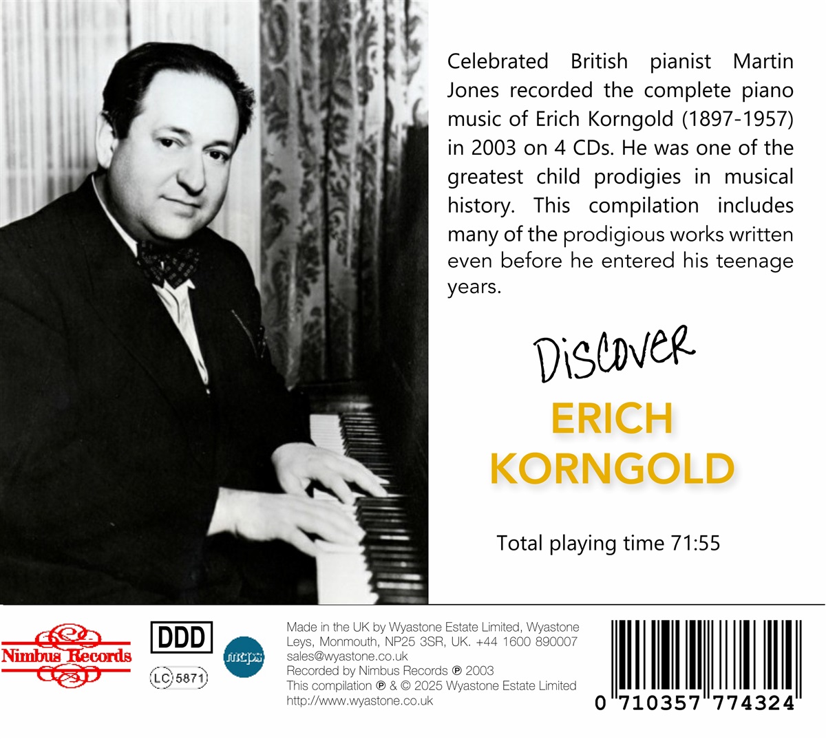 Der österreichische Komponist Erich Wolfgang Korngold (1897–1957) war eines der größten Wunderkinder der Musikgeschichte. Sein Klavierstil war von Anfang an sehr persönlich und ausgereift, obwohl er offenbar kaum Unterricht auf diesem Instrument hatte. Abgesehen von einigen wenigen Stunden im Alter von fünf Jahren (nicht bei einem renommierten Lehrer, sondern bei einem bedürftigen Verwandten) scheint er sich alles selbst beigebracht zu haben. Der berühmte britische Pianist Martin Jones veröffentlichte „The Complete Piano Music of Erich Korngold” auf vier CDs, die noch immer erhältlich sind. Die vorliegende Zusammenstellung enthält viele der erstaunlichen Werke, die Korngold noch vor seiner Teenagerzeit komponierte.