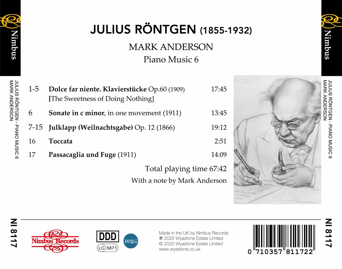 Diese Aufnahme bietet dem Hörer einen chronologischen Überblick über Julius Röntgens kreatives Schaffen, von seiner frühesten veröffentlichten Komposition aus dem Jahr 1864 – als er gerade einmal neun Jahre alt war – bis hin zu Stücken, die er fünf Jahrzehnte später als reifer Komponist schrieb. Letztere offenbaren einen Komponisten von herausragendem Können, vielfältigen Einflüssen und einem Meister der musikalischen Formen und Kompositionstechniken. Es heißt, dass man in Röntgens Werk vergeblich nach etwas wirklich Originellem oder Schockierendem suchen würde. Allerdings sind auf dieser Aufnahme Werke enthalten, die diese Annahme widerlegen. Pianist Mark Anderson erwähnt drei Werke, die ganz besonders herausragen und wirklich einzigartig und kraftvoll originell sind. Das erste ist eine kurze Toccata, die so etwas wie ein Rätselwerk ist, da sie nie veröffentlicht wurde und kein Kompositionsdatum hat. Die anderen sind die Sonate in c-Moll aus dem Jahr 1877 und die Passacaglia und Fuge aus dem Jahr 1911. Julius Röntgen komponierte über 600 Werke und ist vor allem für seine Konzerte, Sinfonien und Kammermusik bekannt. Mark Andersons Aufnahmen und Darbietungen wurden von der Kritik hoch gelobt. Er trat häufig als Rezitalist, Solist und Kammermusiker auf. Er stand in Japan, in weiten Teilen Europas und Großbritanniens, in Irland und Nordamerika auf der Bühne.