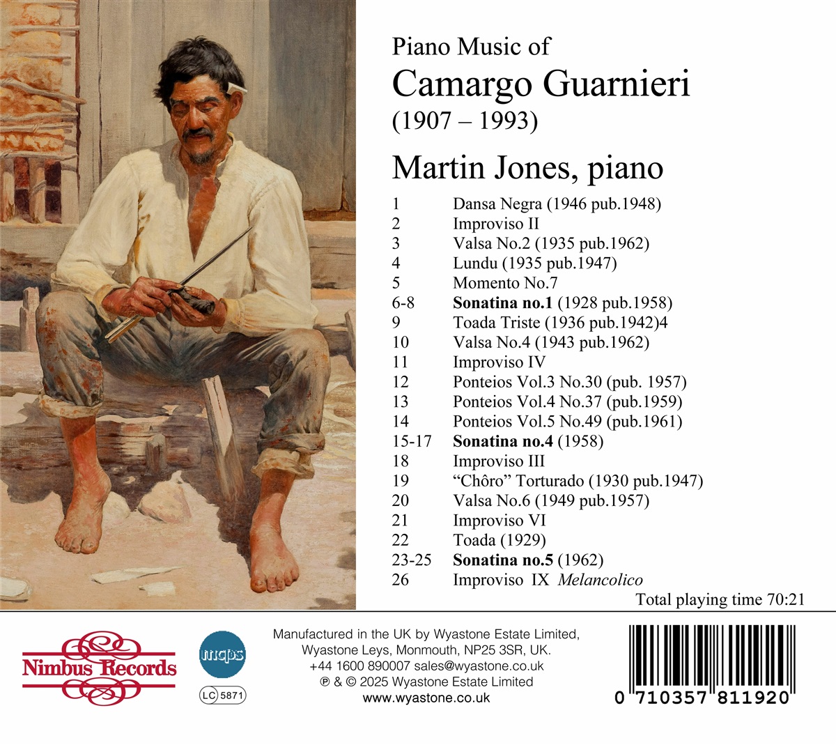 Die kurzen Einzelstücke dieser Aufnahme, die „Valsas“, „Improvisos“ und „Momentos“, zeigen die sanftere Seite von Guarnieris musikalischer Sprache. Der Walzer ist eine Form, in der jeder brasilianische Komponist seinen nationalen Charakter zum Ausdruck gebracht hat, sodass er fast zu einer neuen, unverwechselbaren Form geworden ist. Guarnieris Valsas haben alle eine Moll-Tonart und zeichnen sich durch interne Melodien aus, die von beiden Händen gespielt und von chromatischen Modulationen und Verzierungen umrankt sind. Ihre Stimmung ist von Sehnsucht geprägt, die nun fast vollständig von ihrem tänzerischen Charakter befreit ist. Die Wirkung all dieser Stücke, von denen viele extreme Miniaturen sind, ist von sanfter Nostalgie geprägt. Dieses Recital ist in drei Gruppen gegliedert, die jeweils eine abwechslungsreiche Auswahl kurzer Stücke enthalten und mit einer Sonatine enden. Es gibt keine chronologische Abfolge, da zwischen der Komposition und der Veröffentlichung oft Jahrzehnte lagen, was für die Gestaltung des Programms nicht relevant erschien. Martin Jones ist seit seinem internationalen Durchbruch 1968, als er den Dame Myra Hess Award erhielt, einer der angesehensten Solopianisten Großbritanniens. Er hat über 90 Aufnahmen mit selten gespielter Musik veröffentlicht, darunter die Gesamtwerke von 18 Komponisten.