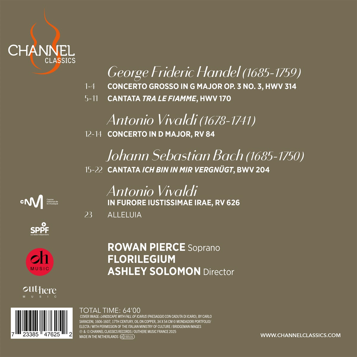 In einer neuen Aufnahme weltlicher Kantaten von G. F. Händel und J. S. Bach singt die Sopranistin Rowan Pierce gemeinsam mit dem Ensemble Florilegium unter der Leitung von Ashley Solomon. "Tra le fiamme" ist eine von Händels Kantaten im italienischen Stil, die stimmliche Virtuosität mit tiefer emotionaler Ausdruckskraft verbindet. Bachs "Ich bin in mir vergnügt" ist ein elegantes Beispiel für eine seiner weltlichen Kantaten, die sich durch ihre reflektierte Auseinandersetzung mit Themen des inneren Friedens, der Genügsamkeit und der stoischen Philosophie auszeichnet - Qualitäten, die Bachs Interesse an moralischen und philosophischen Themen außerhalb seiner geistlichen Musik widerspiegeln. Ebenfalls im Programm enthalten ist das abschließende virtuose Alleluja aus Vivaldis Motette "In furore iustissimae irae" sowie Instrumentalkonzerte von Vivaldi und Händel.