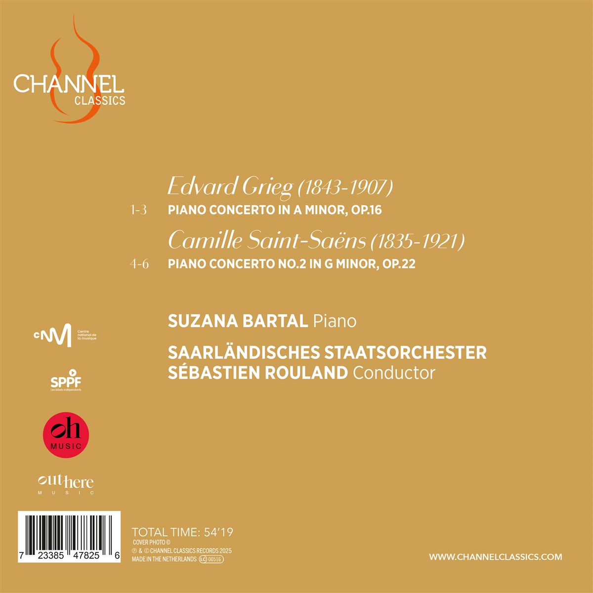 Die französisch-ungarische Pianistin Suzana Bartal spielt zusammen mit Sébastien Rouland und dem Saarländischen Staatsorchester zwei Dauerbrenner des romantischen Repertoires ein: Griegs Klavierkonzert in a-Moll und Camille Saint-Saëns' Klavierkonzert Nr. 2 in g-Moll. Obwohl das 2. Klavierkonzert von Saint-Saëns bei seiner Uraufführung mit dem Komponisten am Klavier keinen Erfolg hatte, wurde es später vom Publikum geliebt und ist wahrscheinlich das meistgespielte seiner fünf Klavierkonzerte. Nur wenige Musikstücke sind so ikonisch wie das einzige Konzert, das Grieg je vollendet hat: sein berühmtes Klavierkonzert in a-Moll. Als es 1870 entstand, hat Liszt es bekanntlich vom Blatt gelesen und in den höchsten Tönen gelobt; seither ist es eines der beliebtesten Werke der Klassik.