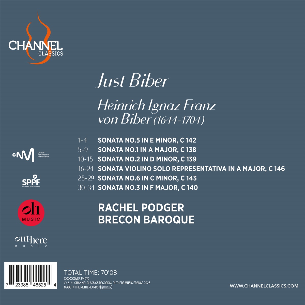 Rachel Podger, Geigerin und musikalische Direktorin von Brecon Baroque spielt mit ihrem Ensemble auf dem Album „Just Biber" Sonaten des Komponisten Heinrich Ignaz Franz von Biber. Sie wurden aus seiner 1681 erschienenen Sammlung Sonatæ Violino Solo ausgewählt und sind äußerst virtuose Werke. Biber hatte Freude daran, den Klang der Geige zu verfremden, sie Tierstimmen imitieren zu lassen und den Zuhörer zu überraschen.