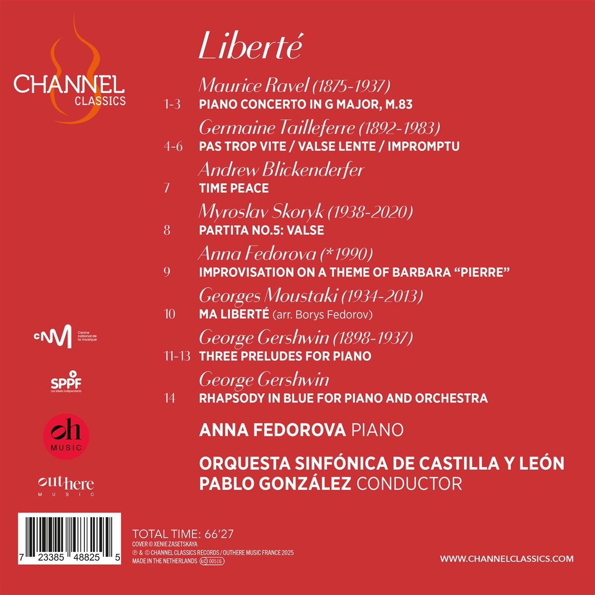 "LIberté", das neue Album der ukrainischen Pianistin Anna Fedorova, ist ein kultureller und musikalischer Dialog zwischen Frankreich und Amerika. Der Einfluss des Jazz spielt eine zentrale Rolle in dieser Hommage an französische und amerikanische Komponisten, deren Werke Genre- und Landesgrenzen überschreiten. Herzstück des Programms, das in Zusammenarbeit mit dem Orquesta Sinfónica de Castilla y León unter der Leitung von Pablo González eingespielt wurde, bilden Ravels Klavierkonzert in G-Dur und Gershwins „Rhapsody in Blue". Ergänzt wird das Programm durch kurze Solostücke, die die zentralen Themen des Albums aufgreifen: drei Miniaturen von Germaine Tailleferre, eine von Andrew Blickenderfer, sowie der jazzige „Valse“ aus der Partita Nr. 5 von Fedorovas Landsmann Myroslav Skoryk. Abgerundet wird „Liberté" durch zwei französische Chansons.