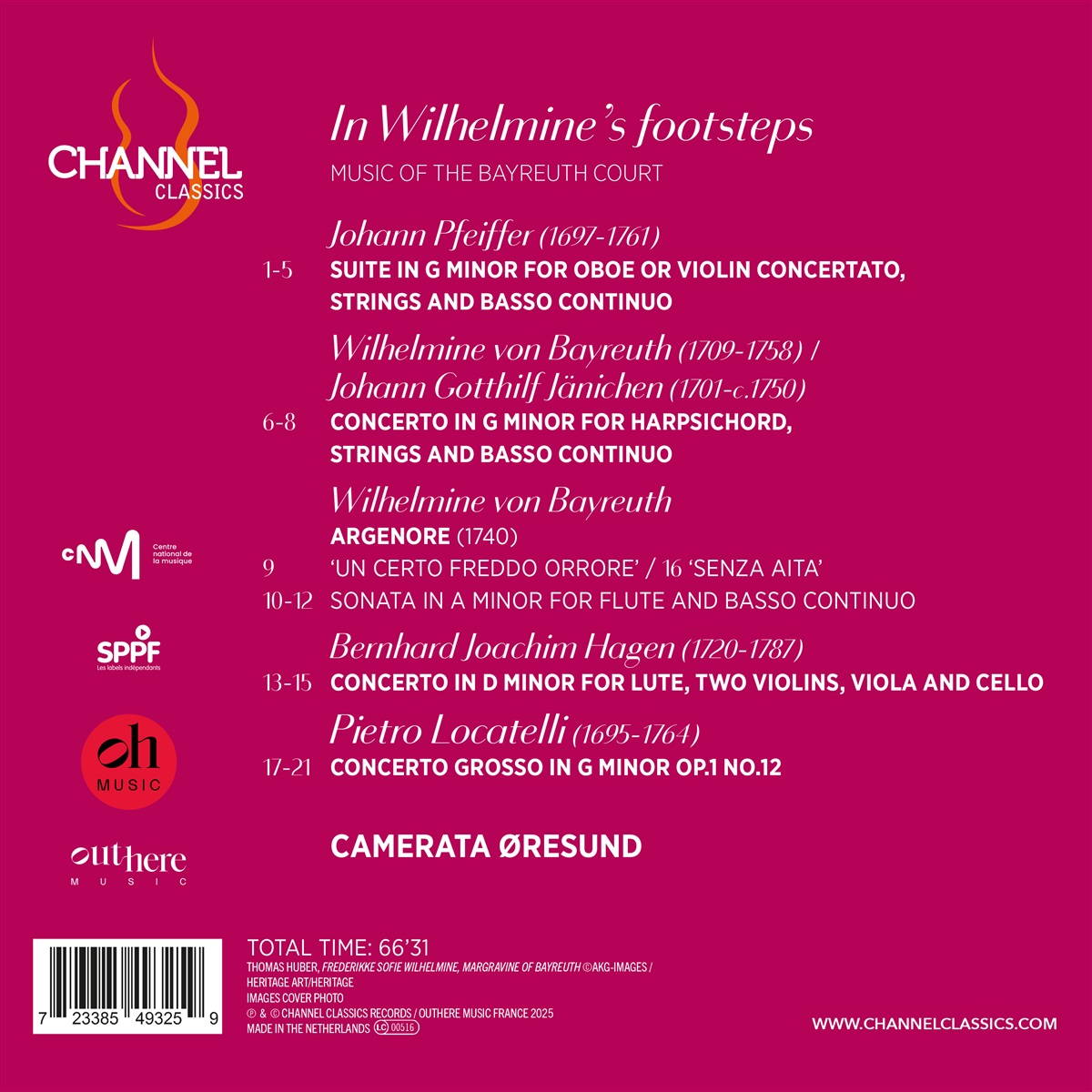 Das Barockensemble Camerata Øresund und sein musikalischer Leiter/Violinist Peter Spissky erkunden die Welt der Wilhelmine von Bayreuth (1709-1758), welche sich als Komponistin, Instrumentalistin und Kunstmäzenin einen Namen machte. Die Aufnahme bringt Werke von Wilhelmine und Musikern aus ihrem Umkreis ans Licht, wobei einige lang in Vergessenheit geratene Stücke wieder zu entdecken sind. Wilhelmines Unternehmergeist, ihr Intellekt, ihr Talent und ihre tiefe Liebe zur Musik und zu den Künsten bleiben auch heute eine Quelle der Inspiration. Dieses Album ist eine Hommage an das Leben und das Vermächtnis dieser bemerkenswerten Frau der Künste und enthüllt lebendige musikalische Farben und Klänge in den Konzerten, Tänzen und Arien.