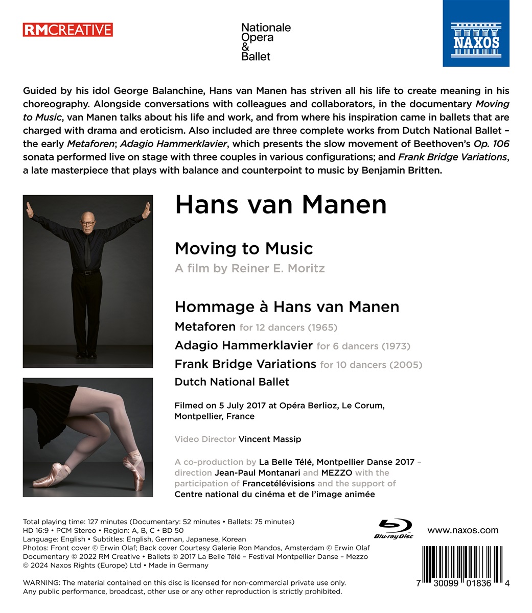 Unter der Anleitung seines Idols George Balanchine hat Hans van Manen sein ganzes Leben lang danach gestrebt, in seinen Choreografien Bedeutung zu schaffen. In der Dokumentation „Moving to Music“ spricht van Manen über sein Leben und seine Arbeit und darüber, woher seine Inspiration für Ballette kam, die voller Drama und Erotik sind. Außerdem sind drei vollständige Werke des Niederländischen Nationalballetts enthalten – die frühen „Metaforen“, „Adagio Hammerklavier“, das den langsamen Satz von Beethovens Sonate Op. 106 live auf der Bühne mit drei Paaren in verschiedenen Konfigurationen aufführt, und „Frank Bridge Variations“, ein spätes Meisterwerk, das mit Balance und Kontrapunkt zu Musik von Benjamin Britten spielt.