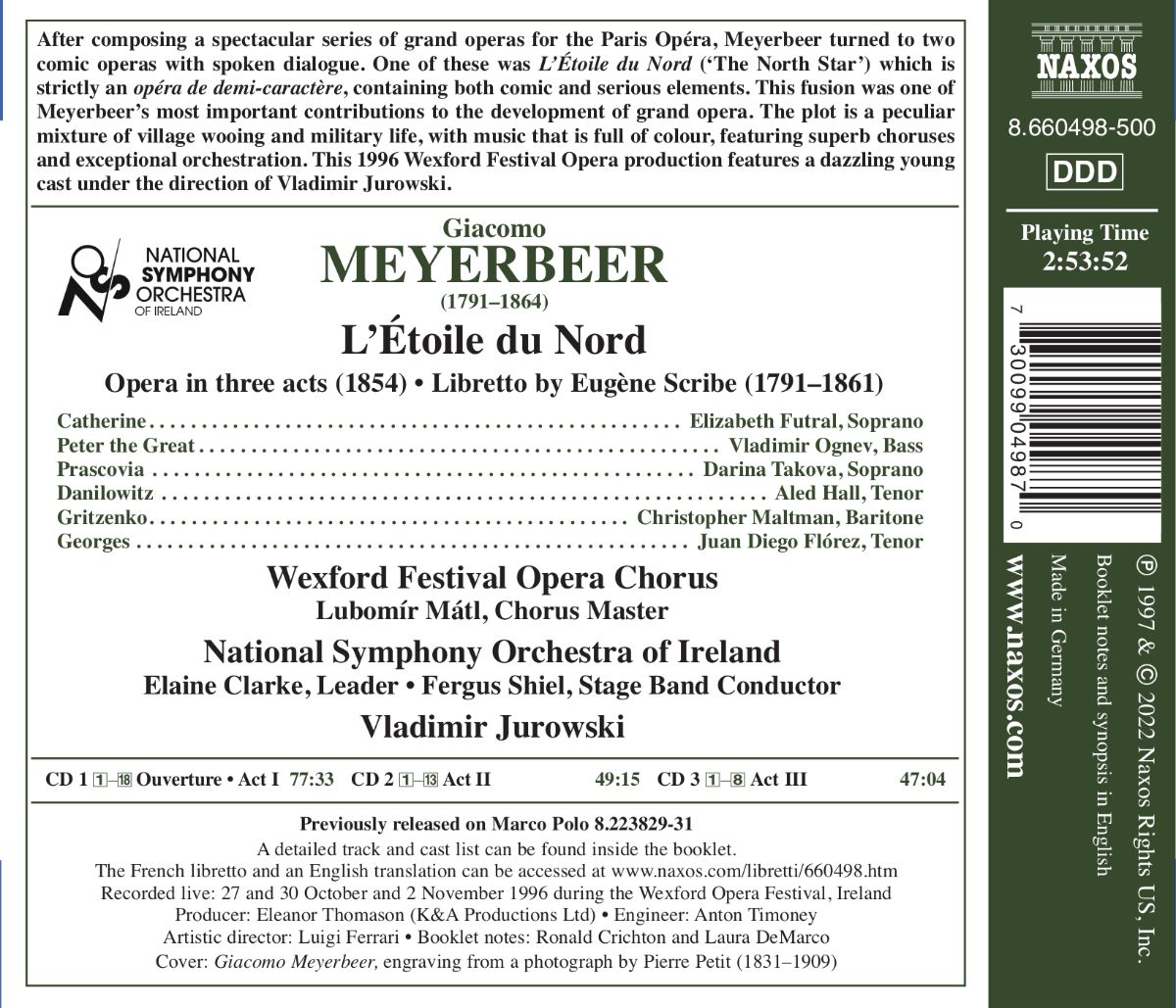 Nach einer Reihe spektakulärer Grand Opéras, wandte sich Giacomo Meyerbeer zwei komischen Opern mit gesprochenen Dialogen zu. Eine davon war „L'Étoile du Nord“, eine Opéra de demi-caractère, die sowohl komische als auch ernste Elemente enthält. Die Handlung ist eine eigentümliche Mischung aus bäuerlichem Brautwerben und Militärromantik, mit einer farbenprächtigen Musik, die sich durch großartige Chöre und eine außergewöhnliche Orchestrierung auszeichnet. Diese Produktion der Wexford Festival Opera von 1996 zeichnet sich durch eine schillernde Besetzung aus, u. a. mit den blutjungen Juan Diego Flórez und Christopher Maltman. Der junge Vladimir Jurowski leitet das National Symphony Orchestra of Ireland.