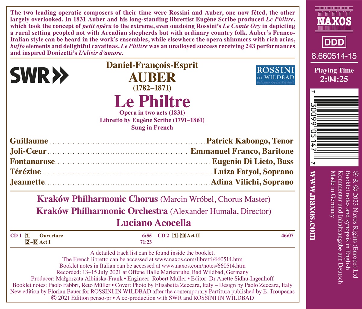 Daniel-François-Esprit Auber, der heute oft übersehen wird, und Gioachino Rossini waren die führenden Opernkomponisten ihrer Zeit. 1831 hoben Auber und sein Librettist Eugène Scribe mit „Le Philtre“ das Genre der Petit Opéra auf die Spitze und erschufen eine ländliche Szenerie, in der nicht idyllische Schäfer agierten, sondern die ganz gewöhnliche Landbevölkerung. Aubers franko-italienischer Stil wird in den Ensemble-Stücken deutlich, während sonst volltönende Arien zu hören sind, durchmischt mit Buffo-Elementen und entzückenden Cavatinen. „Le Philtre“ war ausnehmend erfolgreich, wurde 243 Mal aufgeführt und inspirierte Donizetti zu seiner Oper „L’elisir d’amore“.
