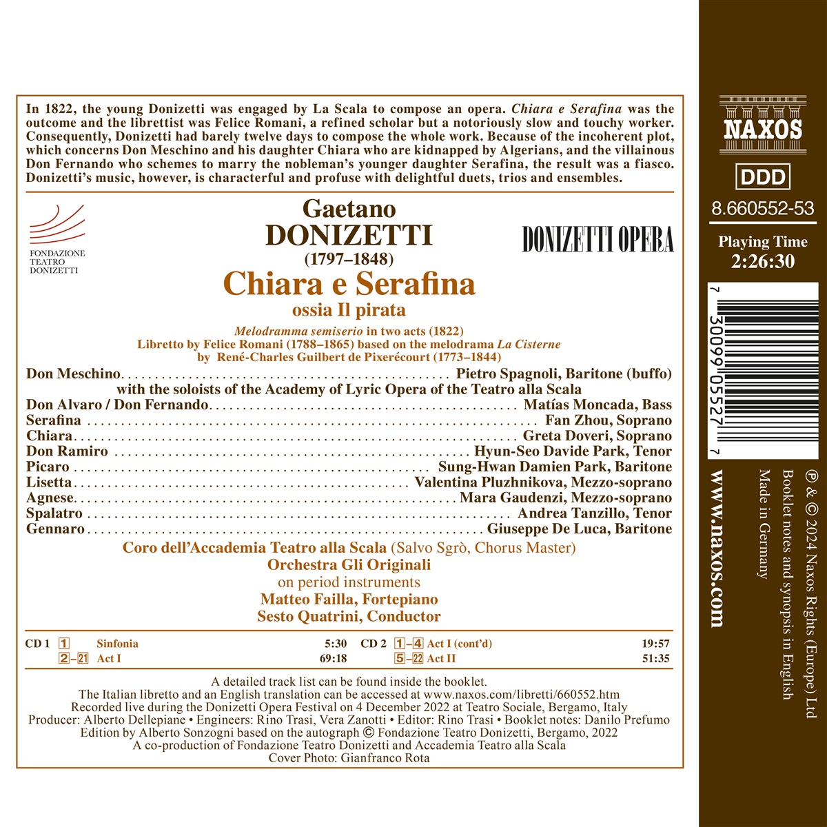 Trotz der begeisterten Reaktionen auf seine ersten Opern war Gaetano Donizetti noch jung und ziemlich unerfahren, als er 1822 den Auftrag erhielt, „Chiara e Serafina“ für die Mailänder Scala zu schreiben. Das in aller Eile komponierte Werk stieß bei der Premiere vornehmlich auf Ablehnung und verschwand danach spurlos. Dank der Wiederaufführung beim Donizetti-Festival in Bergamo kehrte „Chiara e Serafina“ schließlich nach genau 200 Jahren auf die Bühne zurück: eine unterhaltsame Geschichte über Piraten, Liebhaber, Verkleidungen, Betrug und Gefahren im Mallorca des 17. Jahrhunderts.