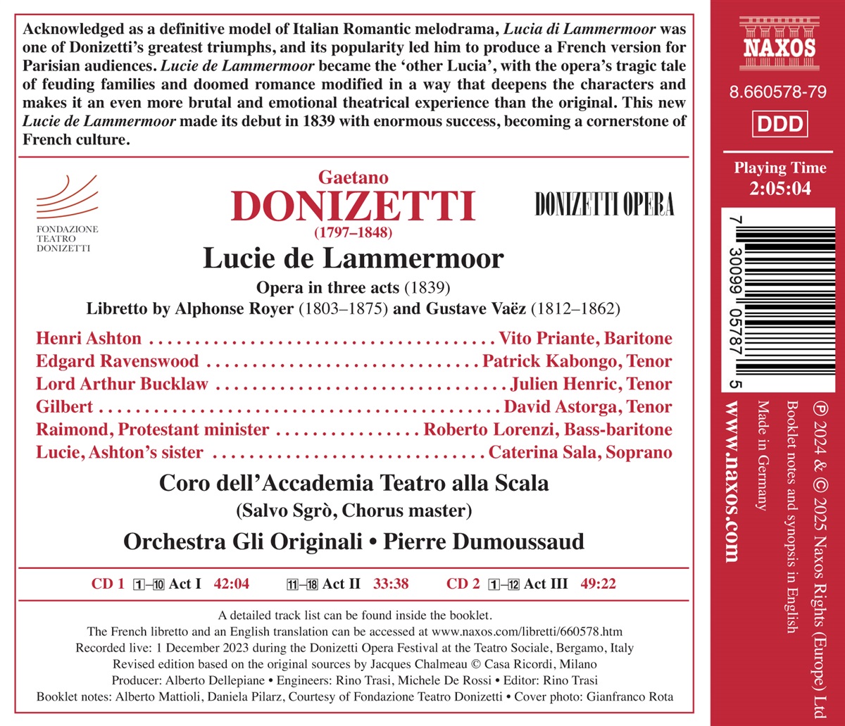 „Lucia di Lammermoor“ gilt als das Grundmodell des italienischen romantischen Melodrams und war einer der größten Erfolge von Gaetano Donizetti. Die Popularität des Werks veranlasste ihn, eine französische Version für das Pariser Publikum zu produzieren. „Lucie de Lammermoor“ wurde zur ‚anderen Lucia‘, wobei die tragische Geschichte der Oper von verfeindeten Familien und einer zum Scheitern verurteilten Romanze so modifiziert wurde, dass die Charaktere vertieft und das Theatererlebnis noch brutaler und emotionaler wurde als im Original. Diese neue ‚Lucie de Lammermoor‘ feierte 1839 mit großem Erfolg ihr Debüt und wurde zu einem Eckpfeiler der französischen Kultur. Die hervorragende Besetzung dieser Produktion wird von der Sopranistin Caterina Sala angeführt, die 2020 den ersten Preis beim Internationalen Opernwettbewerb in Portofino gewann. Pierre Dumoussaud, der musikalische Leiter dieser Produktion, gewann 2022 den ersten Victoire de la Musique Classique. Als Leiter des Orchesters Gli Originali auf historischen Instrumenten bevorzugt er französische Musik des 19. und 20. Jahrhunderts. Sein Olivier-Greif-Album wurde mit einem Diapason d'Or und einem Choc de Classica ausgezeichnet. Dieses Album ist die Audioversion der BluRay und DVD von „Lucie de Lammermoor“, die im September 2024 veröffentlicht wurden.