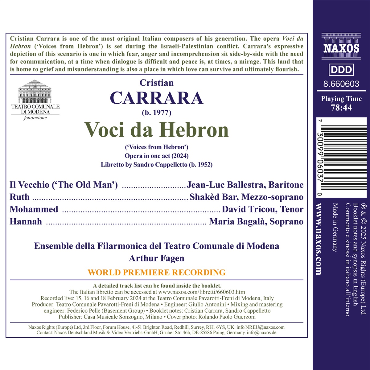 Cristian Carrara ist einer der originellsten italienischen Komponisten seiner Generation. Die Oper „Voci da Hebron” (Stimmen aus Hebron) spielt während des israelisch-palästinensischen Konflikts. Carraras ausdrucksstarke Darstellung dieses Szenarios zeigt, wie Angst, Wut und Unverständnis neben dem Bedürfnis nach Kommunikation bestehen, in einer Zeit, in der der Dialog schwierig ist und Frieden manchmal nur eine Illusion zu sein scheint. Dieses Land, in dem Trauer und Missverständnisse herrschen, ist auch ein Ort, an dem Liebe überleben und schließlich gedeihen kann. Arthur Fagen hat an den renommiertesten Opernhäusern der Welt dirigiert, darunter die Metropolitan Opera und die Wiener Staatsoper, und renommierte Orchester wie das Orchestre de la Suisse Romande, das London Symphony Orchestra, das Royal Philharmonic Orchestra und das Philharmonia Orchestra geleitet. Diese Produktion von Voci da Hebron wurde im Februar 2024 an der Opéra-Théâtre Metz Métropole und im Teatro Comunale Pavarotti-Freni Modena aufgeführt. Diese Veröffentlichung folgt auf Cristian Carraras „The Devil’s Bridge“, ein Album, das von MusicWeb International mit folgenden Worten begrüßt wurde: ‚Dieses Album zu hören, war ein wahrer Genuss. Ich hatte zuvor noch kein Werk von Carrara gehört, aber ich hoffe aufrichtig, dass dies nicht die letzte [CD] mit seiner Musik sein wird, die veröffentlicht wird.‘