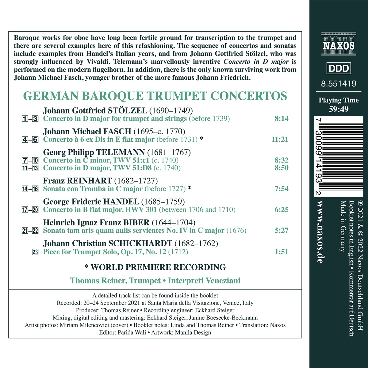 Barockkompositionen für Oboe sind seit langem ein fruchtbarer Boden für Transkriptionen auf die Trompete. Dieses Album fasst einige gelungene Beispiele für solche Neugestaltungen zusammen. Die Konzerte und Sonaten stammen aus Georg Friedrich Händels italienischen Jahren, außerdem von Heinrich Ignaz Franz Biber, Franz Reinhart, Johann Gottfried Stölzel und Georg Philipp Telemann. Sein originelles Konzert in D-Dur wird auf hier auf einem modernen Flügelhorn gespielt. Außerdem erklingt das einzige bekannte erhaltene Werk von Johann Michael Fasch, dem jüngeren Bruder des berühmteren Johann Friedrich.