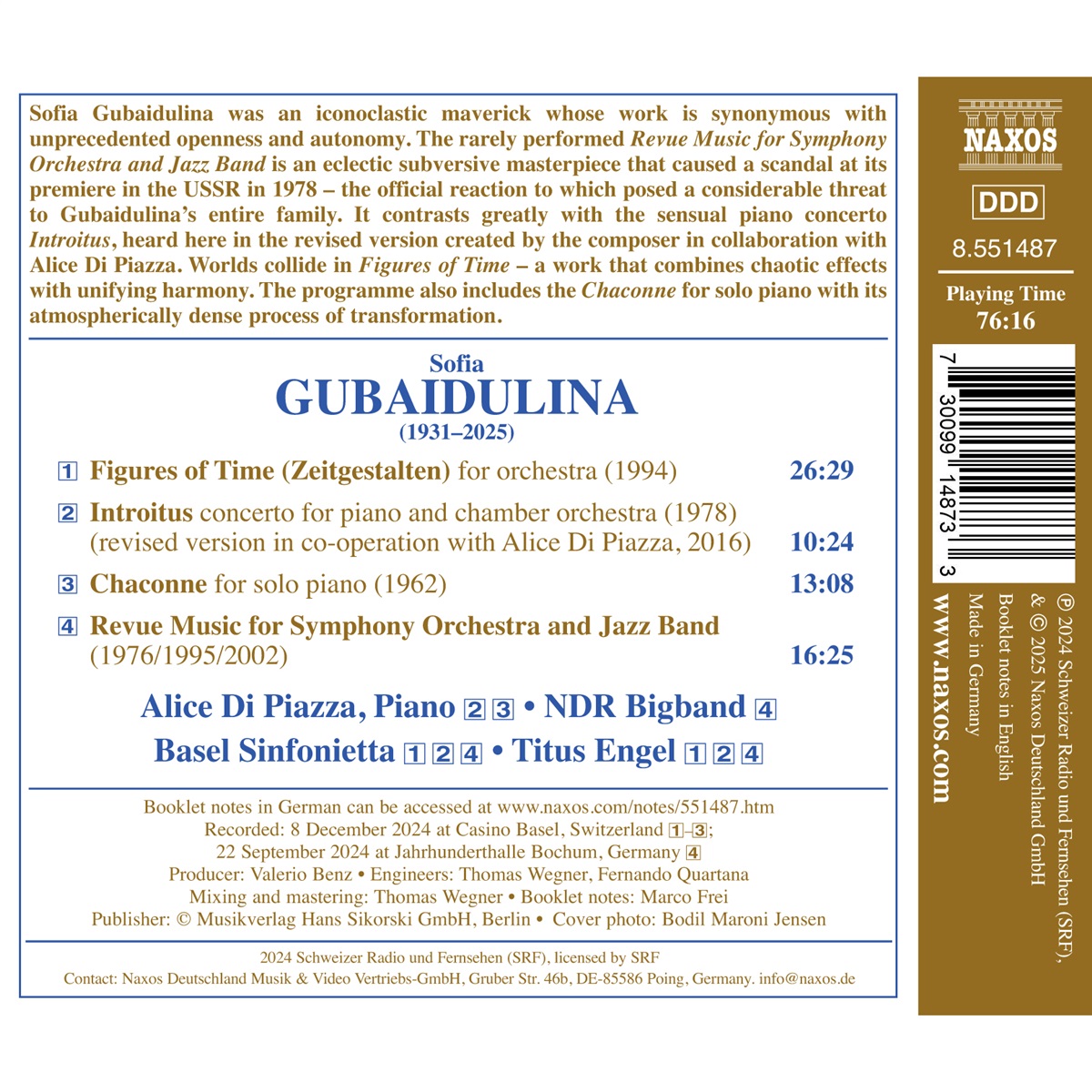 Sofia Gubaidulina war eine ikonoklastische Einzelgängerin, deren Werk für beispiellose Offenheit und Autonomie steht. Das selten aufgeführte Werk „Revue Music for Symphony Orchestra and Jazz Band“ ist ein eklektisches, subversives Meisterwerk, das bei seiner Uraufführung 1978 in der UdSSR einen Skandal auslöste – die offizielle Reaktion darauf stellte eine erhebliche Bedrohung für Gubaidulinas gesamte Familie dar. Es steht in starkem Kontrast zum sinnlichen Klavierkonzert „Introitus“, das hier in der von der Komponistin in Zusammenarbeit mit Alice Di Piazza überarbeiteten Fassung zu hören ist. In „Figures of Time“ prallen Welten aufeinander – ein Werk, das chaotische Effekte mit vereinigender Harmonie verbindet. Auf dem Programm steht außerdem die „Chaconne“ für Soloklavier mit ihrem atmosphärisch dichten Transformationsprozess. Titus Engel ist seit der Saison 2023/24 Chefdirigent der Basel Sinfonietta. Als Gastdirigent trat er mit dem Philharmonia Orchestra, den Sinfonieorchestern des SWR und des WDR, dem Mahler Chamber Orchestra, den Kammerorchestern Zürich und München, dem Ensemble Modern und dem Klangforum Wien auf. Er dirigiert regelmäßig an den Opernhäusern in Stuttgart, Hamburg, Berlin, München, Frankfurt, Hannover, Basel und Lyon und wurde 2020 von der Zeitschrift Opernwelt zum Dirigenten des Jahres gekürt. Der Schweizer Dirigent und Wahlberliner, der sowohl für seine Expertise in historischer Aufführungspraxis als auch für seine präzise Leitung komplexer zeitgenössischer Projekte geschätzt wird, ist auch regelmäßig mit zentralen Werken der Opernliteratur zu hören. Alice Di Piazza gilt international als eine der talentiertesten Pianistinnen ihrer Generation. Sie trat bereits in renommierten Konzertsälen wie dem Gewandhaus in Leipzig, dem KKL Festival in Luzern, dem Stadtcasino in Basel und dem Moskauer Tschaikowsky-Konservatorium auf und arbeitete mit namhaften Dirigenten und Orchestern auf der ganzen Welt zusammen.