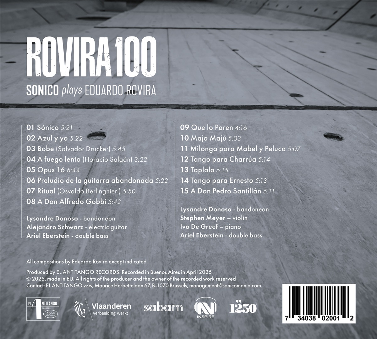 „Rovira 100“ markiert einen doppelten Meilenstein: den 100. Geburtstag von Eduardo Rovira und das 10-jährige Jubiläum von Sonico. Aufgenommen in Buenos Aires während ihrer Lateinamerika-Tournee im April 2025 – gekrönt von einem historischen Auftritt im Teatro Colón – greift dieses fünfte Studioalbum Roviras ikonische Alben „Sónico“ (1969) und „Que lo Paren“ (1975) wieder auf und interpretiert sie neu, sorgfältig rekonstruiert nach jahrelanger Archivforschung. Obwohl Eduardo Rovira oft im Schatten von Astor Piazzolla stand, schlug er seinen eigenen radikalen Weg bei der Erneuerung des Tangos ein, indem er Jazz-Einflüsse, zeitgenössische klassische Techniken und gewagte rhythmische Veränderungen einfließen ließ. Seine komplexe, poetische und filmische Musik hat den Tango weit über seine traditionellen Grenzen hinausgetragen. Das Ensemble Sonico wurde 2015 in Brüssel gegründet und hat sich mit seinen historisch fundierten Aufführungen und bahnbrechenden Archivforschungen internationale Anerkennung erworben. Durch die Transkription und Wiederherstellung verlorener Partituren aus der Mitte des 20. Jahrhunderts hat Sonico vergessenes Repertoire wieder auf die Bühne gebracht. Ihre Tourneen führten sie zu führenden Veranstaltungsorten und Festivals, darunter De Bijloke Gent, Concertgebouw Brügge, Philharmonie Luxemburg, Heidelberger Frühling, Tonhalle Düsseldorf und Cemal Reşit Rey Concert Hall in Istanbul. In dieser Saison geben sie ihr Debüt in der Elbphilharmonie Hamburg und im Bozar Brüssel (Henry Le Bœuf Hall) mit „Sinfonía de Tango“, einer sinfonischen Kreation in Zusammenarbeit mit dem Brussels Philharmonic, die im März 2026 aufgeführt wird.