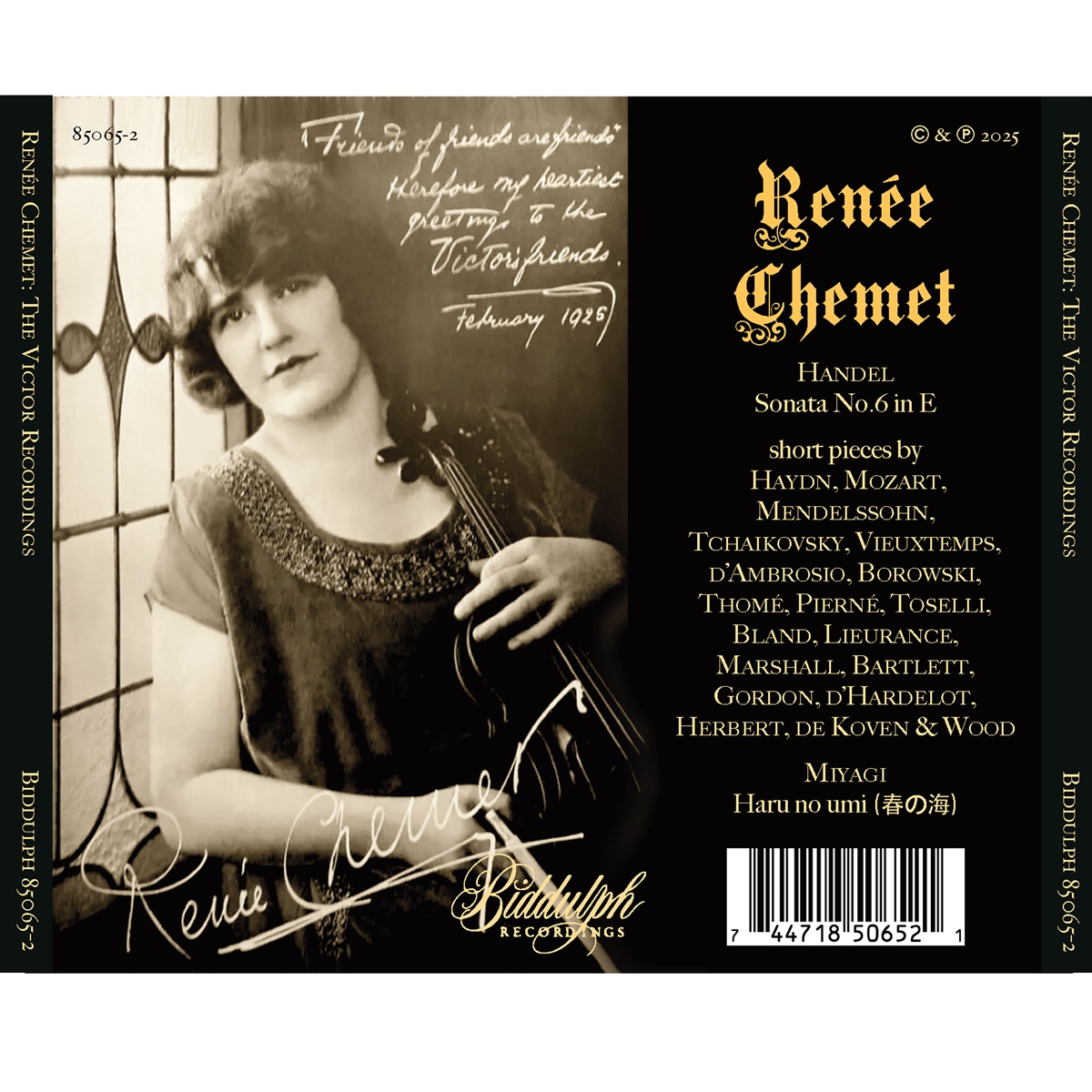Renée Chemet war eine der renommiertesten französischen Geigerinnen des frühen 20. Jahrhunderts. Als gefragte Solistin in ganz Europa und Nordamerika trat sie mit legendären Dirigenten wie Arthur Nikisch, Gustav Mahler und Fritz Steinbach in den großen Musikmetropolen Berlin und Wien auf. Sie kam erstmals 1916 nach London, um mit dem Royal Philharmonic Orchestra unter Thomas Beecham die „Symphonie espagnole“ zu geben, und gab 1921 ihr amerikanisches Konzertdebüt in der Carnegie Hall mit dem dritten Konzert von Saint-Saëns unter Willem Mengelberg. Vom Konzertpublikum geliebt, erhielt sie den Spitznamen „die französische Kreisler“.