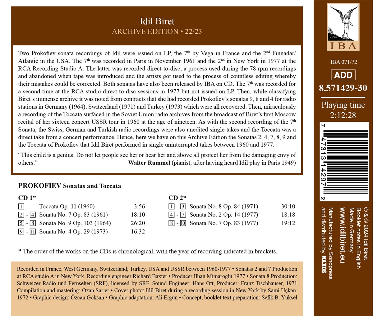 In der Idil-Biret-Archiv-Edition werden mit dem Doppel-Album Vol. 22/23 Aufnahmen von Prokofieff-Sonaten veröffentlicht, die zwischen 1960 und 1977 entstanden. Die Sonate Nr. 7 spielte die Pianistin zweimal ein, einmal 1961 in Paris, das zweite Mal 1977 in New York. Beide Versionen sind hier zu hören. In dem langen Zeitraum dazwischen nahm Idil Biret die Sonaten Nr. 2, 4, 8 und 9 auf.