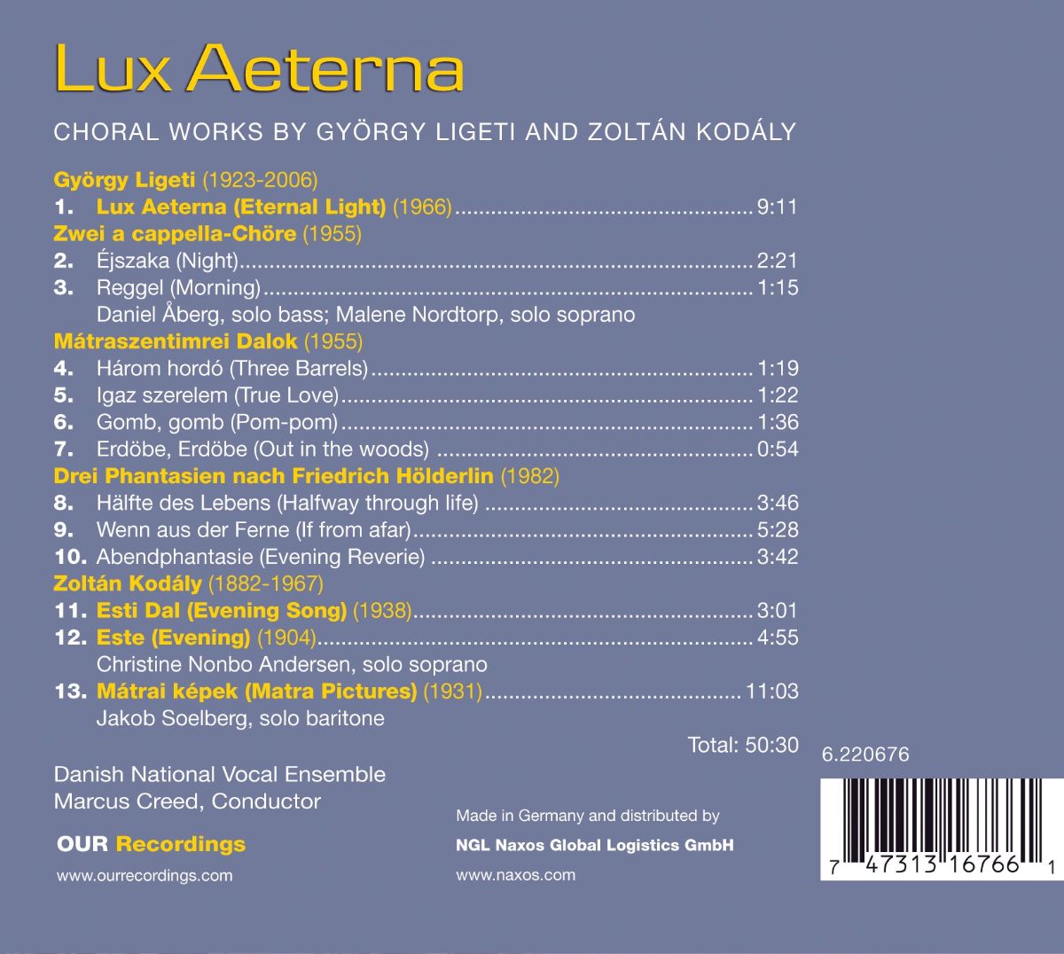 Spätestens mit dem 1966 komponierten „Lux Aeterna“ für 16-stimmigen gemischten Chor a cappella und der Verwendung des Werkes im Kultfilm „2001: Odyssee im Weltraum“ von Stanley Kubrick im Jahre 1968 wurde György Ligeti als zeitgenössischer (Chor-) Komponist wahrgenommen und wurde quasi „über Nacht“ zum Weltstar und zu einer Ikone der Pop-Kultur. Das vorliegende Album des Danish National Vocal Ensemble unter Marcus Creed beleuchtet Ligetis Chorwerk (natürlich inkl. „Lux Aeterna“) und nimmt auch Bezug auf die Werke seines Lehrers Zoltán Kodály.