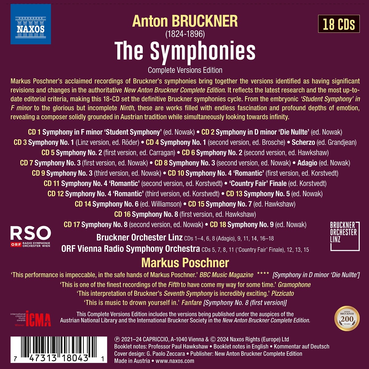 Markus Poschners gefeierte Einspielungen der Sinfonien von Anton Bruckner vereinen die Fassungen, die in der maßgeblichen Anton Bruckner Gesamtausgabe als signifikant überarbeitet und verändert identifiziert wurden. Sie spiegelt die neuesten Forschungsergebnisse und die aktuellsten editorischen Kriterien wider und macht dieses 18-CD-Set zum definitiven Zyklus der Bruckner-Sinfonien. Von der embryonalen "Studentensinfonie" in f-Moll bis hin zur glorreichen, aber unvollendeten Neunten sind dies Werke voller unendlicher Faszination und tiefster Emotionen, die einen Komponisten offenbaren, der fest in der österreichischen Tradition verwurzelt ist und gleichzeitig in die Unendlichkeit blickt. Jede Veröffentlichung dieser Edition, die zwischen 2021 und 2024 aufgenommen wurde, wurde mit begeisterten Reaktionen von der Musikkritik bedacht, die sich positiv über Poschners Ansatz geäußert haben. Die Essenz dieses Ansatzes ist die Bereitschaft, Aufführungstraditionen abzulehnen, die den Buchstaben von Bruckners Partituren zuwiderlaufen, um ihre explosiven leuchtenden Farben und ihren enormen intuitiven und technischen Wagemut zu enthüllen. Die Reihe wurde mit dem International Classical Music Awards (ICMA) 2024 „Special Achievement Award“ ausgezeichnet: „Diese Gesamtausgabe der Bruckner-Sinfonien ist ein außergewöhnliches Projekt, weil es unsere Hörgewohnheiten und unsere musikalische Tradition in Frage stellt. Es verbindet musikwissenschaftliche Forschung mit künstlerischer Exzellenz und bringt dabei die führenden Musikinstitutionen Österreichs zusammen. Kurz gesagt, der typische Bruckner-Klang, und dennoch innovativ.‟