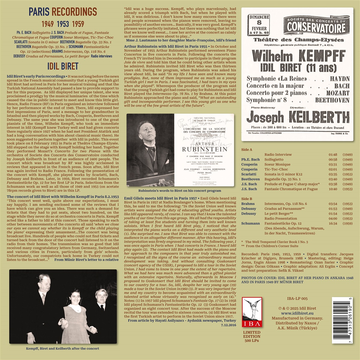 Idil Birets frühe Pariser Aufnahmen (1949–1959) verdeutlichen ihren bemerkenswerten Werdegang vom Wunderkind zur gefeierten Pianistin. Nach ihrem Eintritt in das Pariser Konservatorium im Alter von acht Jahren studierte sie bei renommierten Lehrern wie Nadia Boulanger. 1953 trat Biret im Théâtre des Champs-Élysées mit dem Orchestre de la Société des Concerts du Conservatoire unter Joseph Keilberth auf und stand dabei gemeinsam mit dem legendären Pianisten Wilhelm Kempff auf der Bühne. Diese Zusammenarbeit war ein wichtiger Meilenstein in ihrer Karriere. Ein entscheidender Moment kam 1955, als Arthur Rubinstein, beeindruckt von ihrer Sensibilität und technischen Meisterschaft, ihr eine große Zukunft als Pianistin prophezeite. Birets Repertoire umfasste in diesen Jahren Werke vom Barock bis zur Romantik, darunter Bach, Schumann und Brahms, und spiegelte sowohl ihre Vielseitigkeit als auch ihr tiefes musikalisches Verständnis wider. Diese historischen Aufnahmen fangen den Geist des Paris der Nachkriegszeit und den Aufstieg einer Pianistin ein, die für eine außergewöhnliche internationale Karriere bestimmt war.
